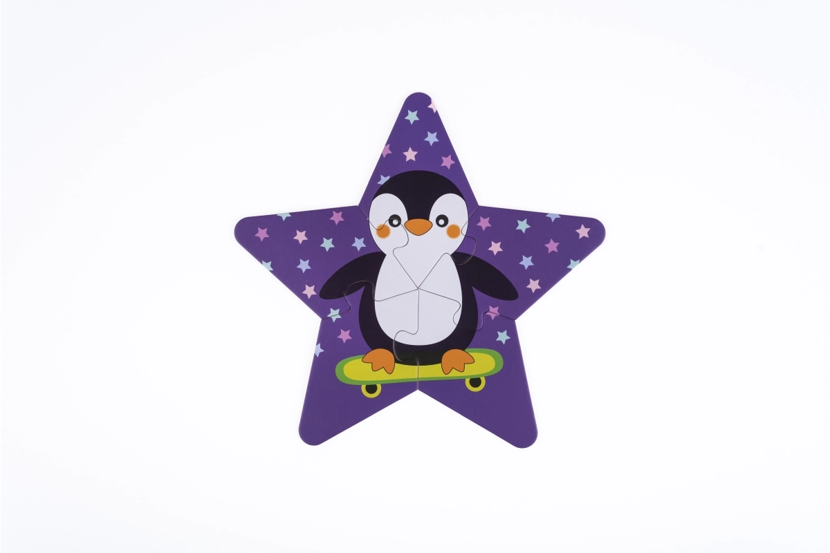 Mīlīgas pingvīna, pandas, pērtiķīša un citu dzīvnieku ilustrācijas motivē bērnus atkārtoti likt puzles un trenēt sīko motoriku.