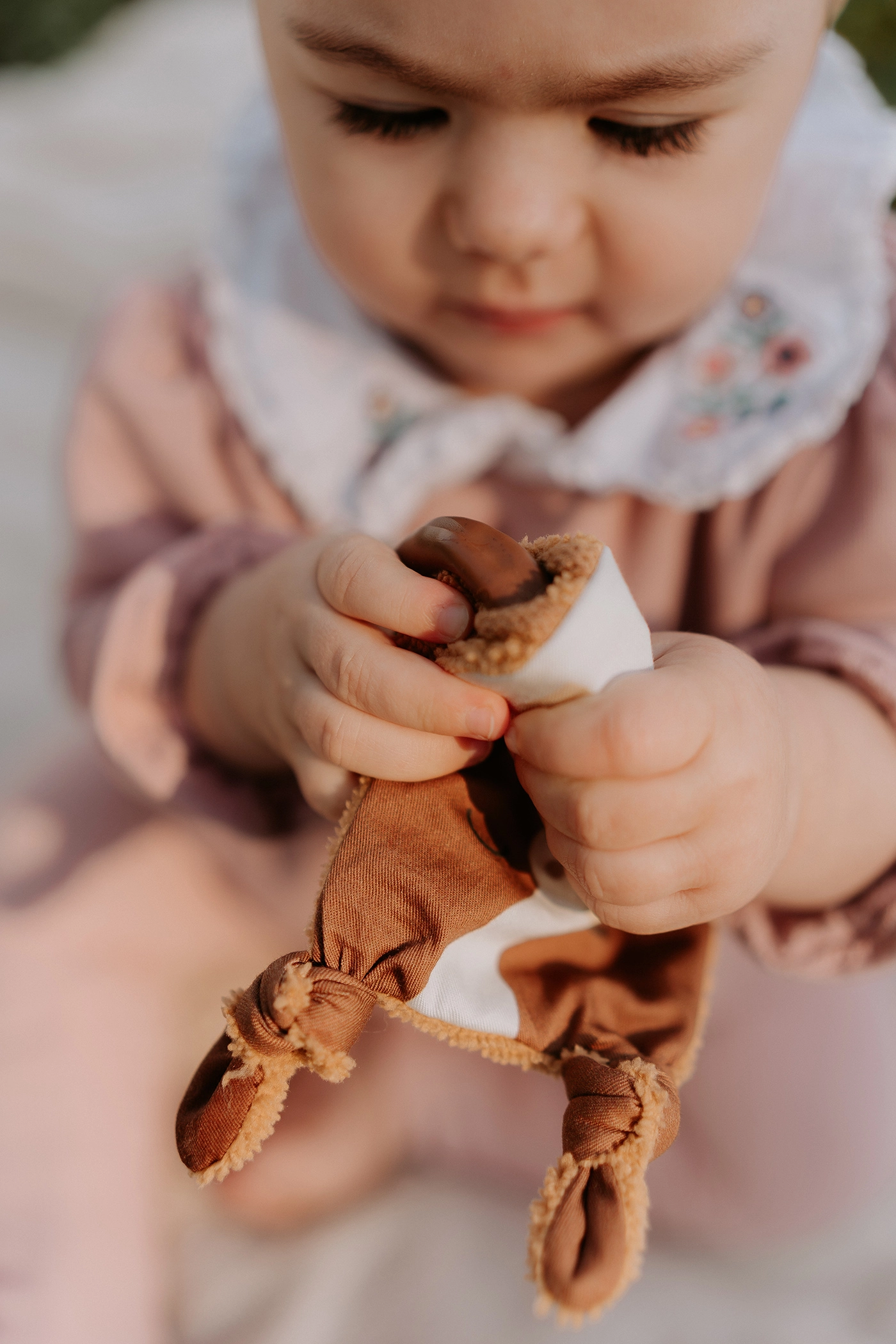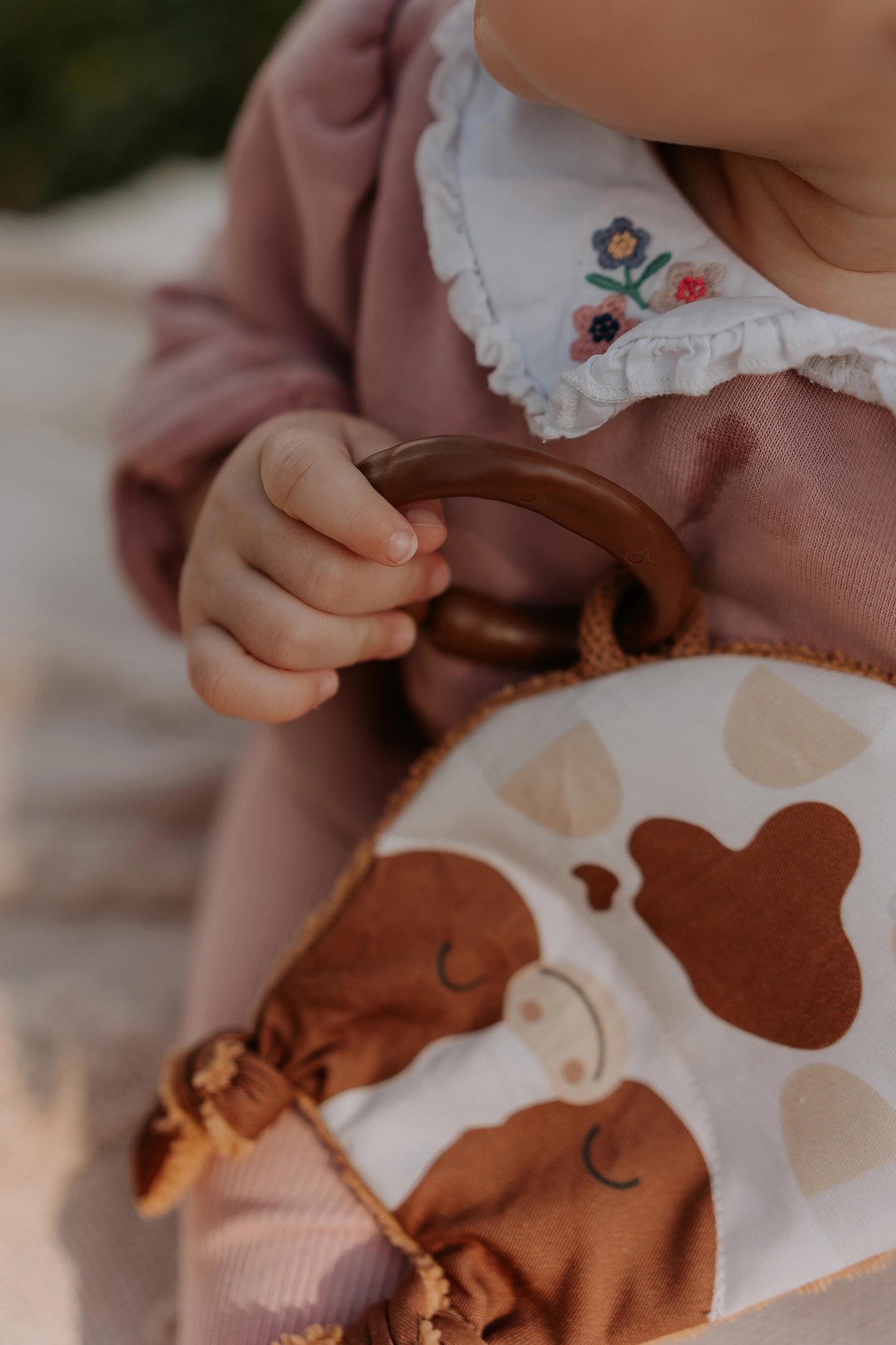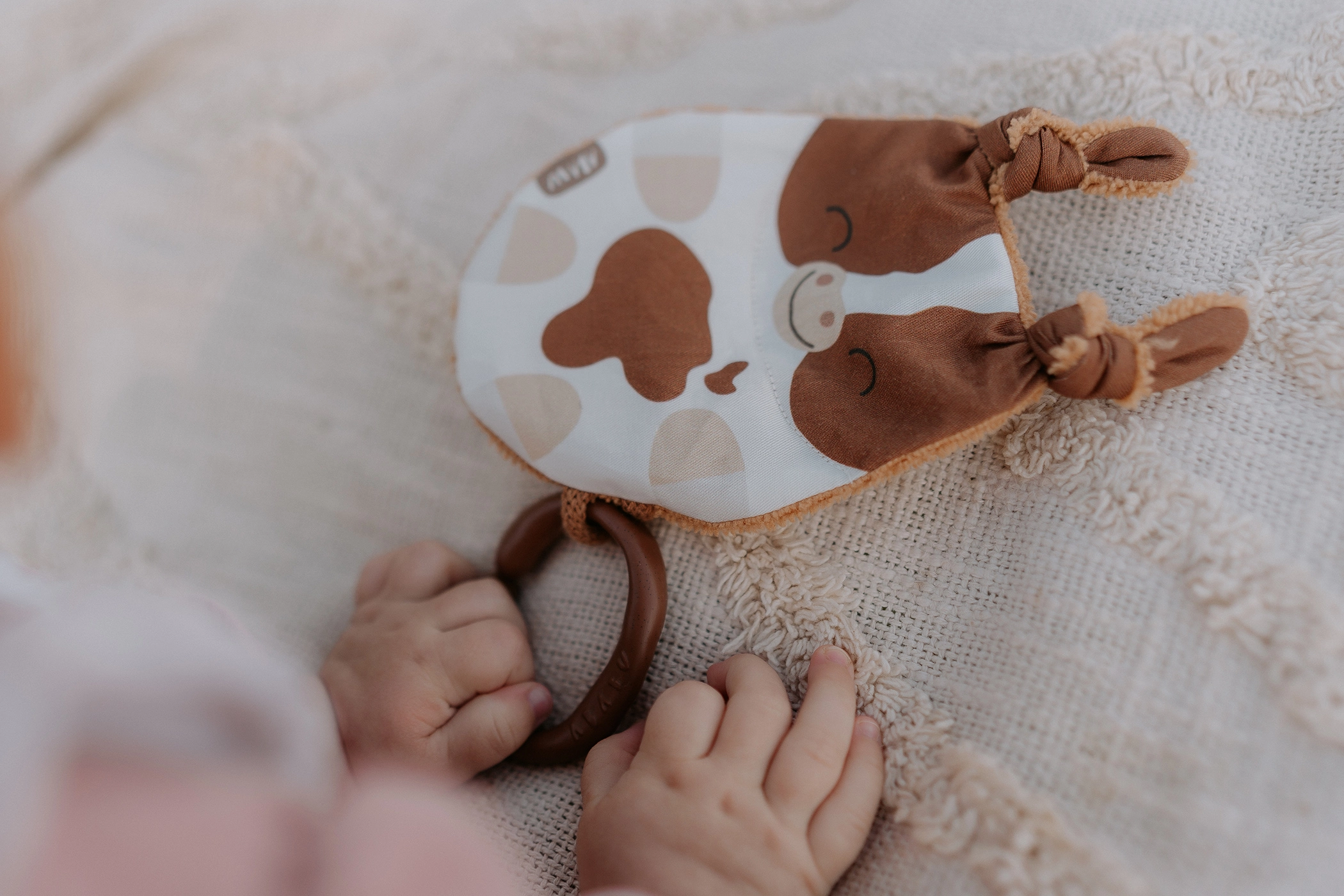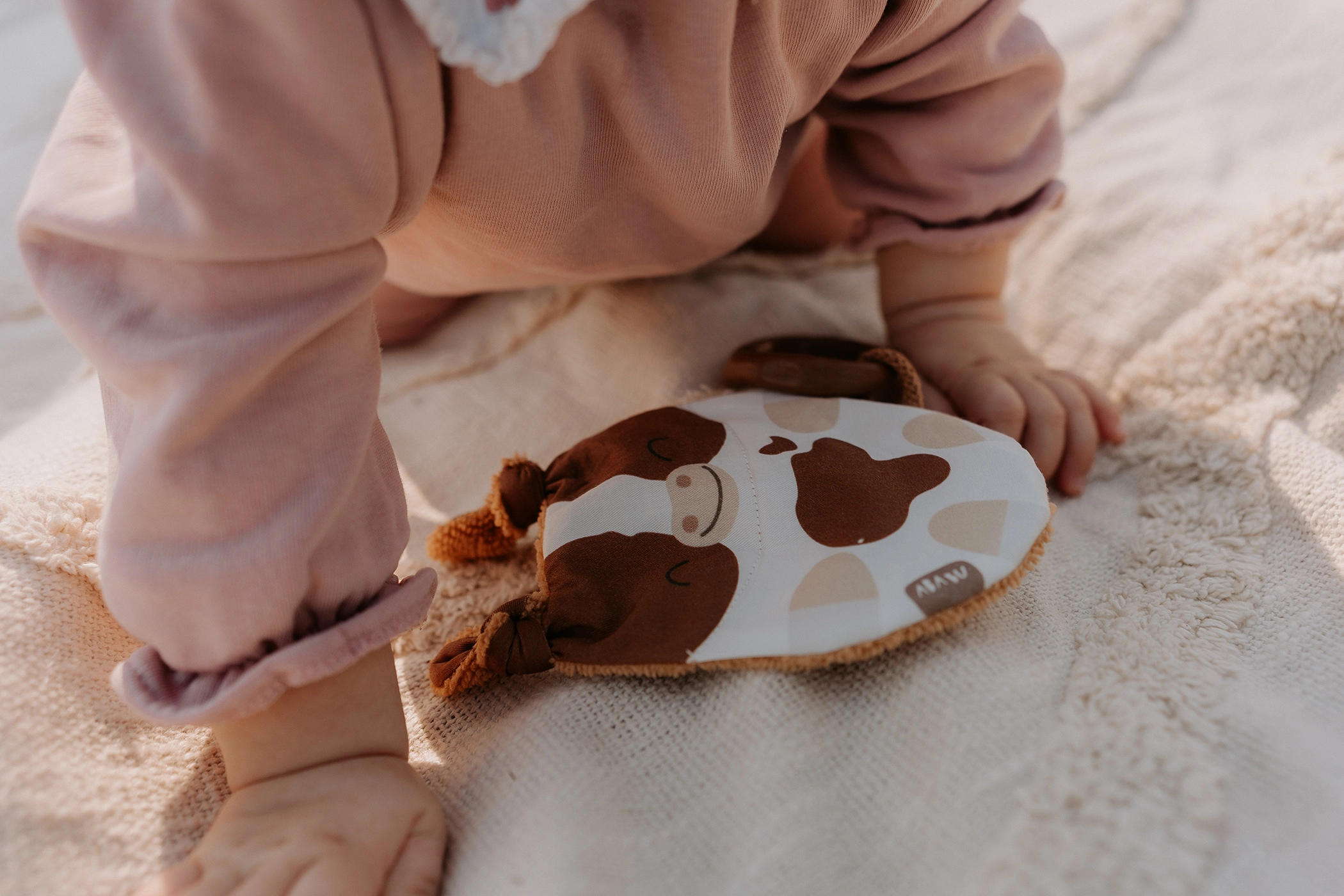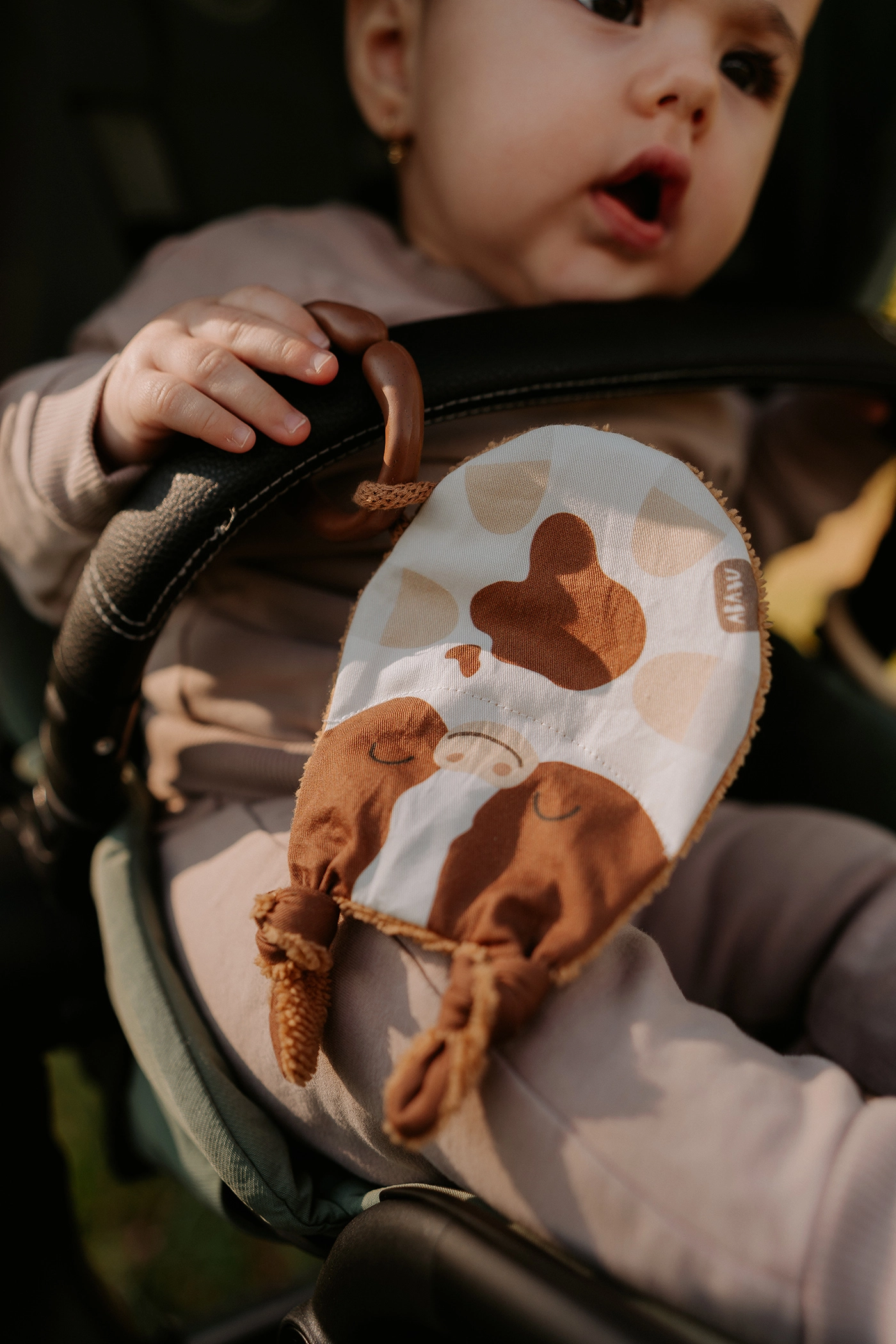 Izcili materiāli un daudz interesantu elementu, kas attīsta mazuļu maņas. Sejiņa ir no 100% kokvilnas ar apdruku, sertificēta bērniem līdz 3 gadiem. Aizmugure no bambusa frotē nodrošina mīkstu un patīkamu virsmu.