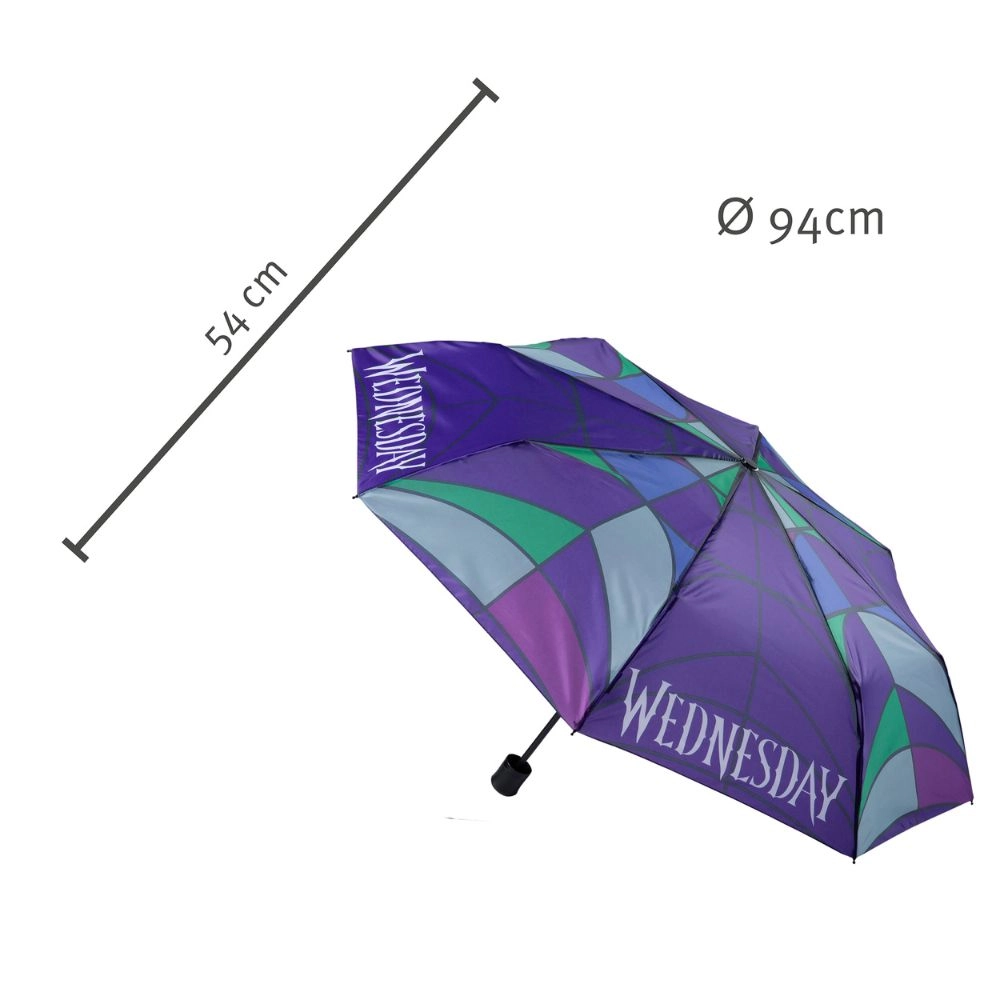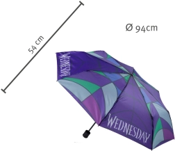 Stilīgs saliekams lietussargs ar tumši elegantu Wednesday motīvu ir ideāls gan mugursomai, gan rokassomiņai. Kompaktais izpildījums nodrošina ērtu pārnēsāšanu un uzticamu aizsardzību pret lietu.