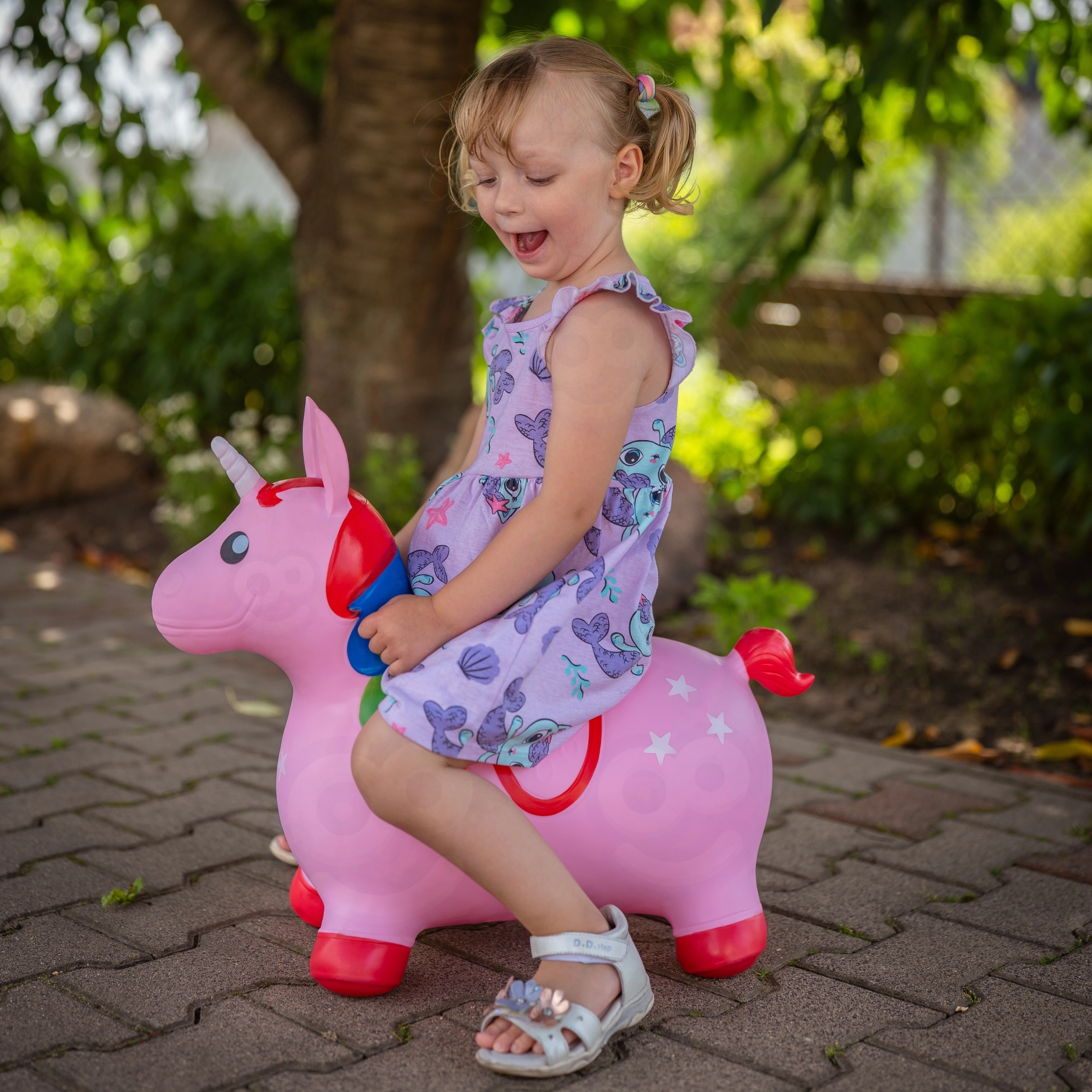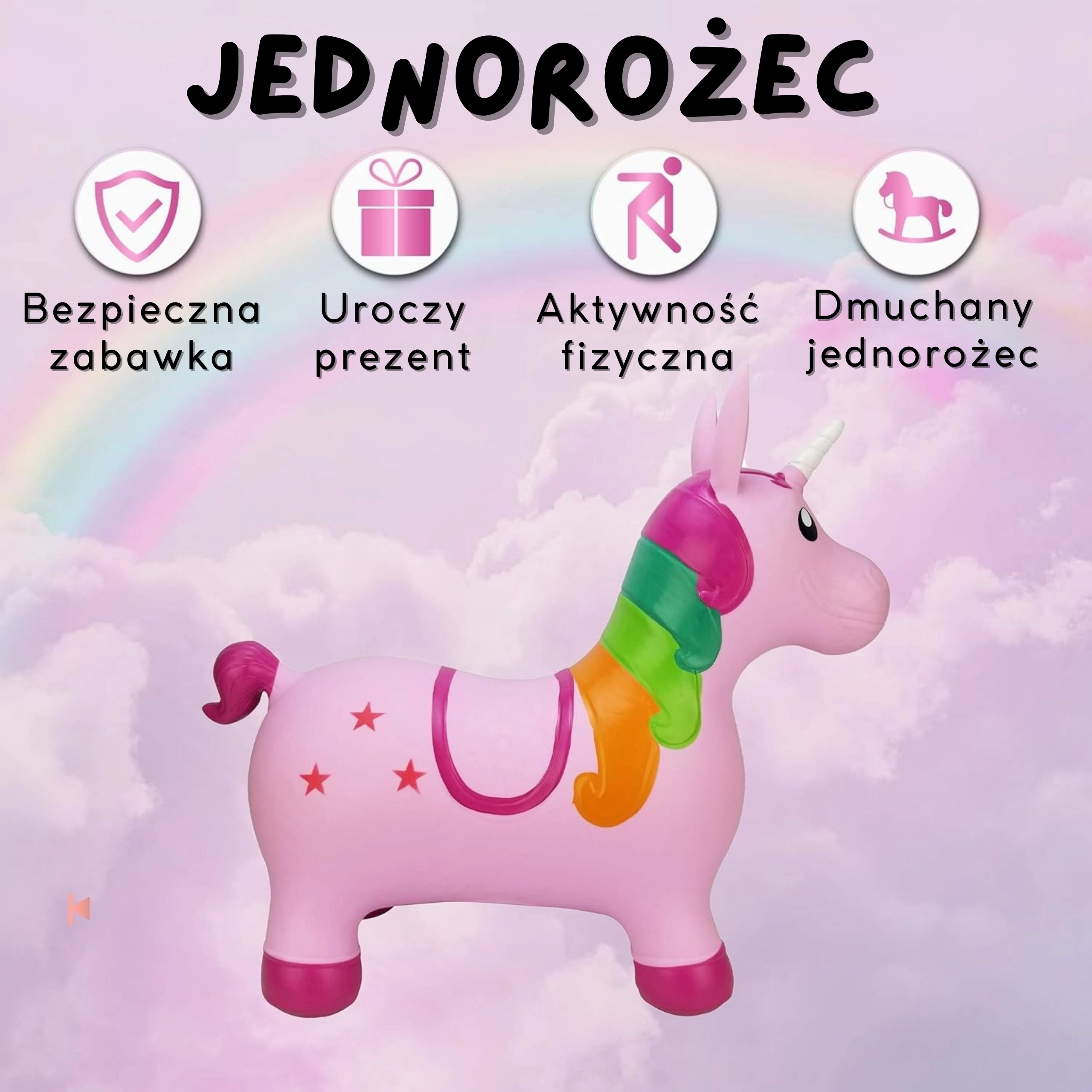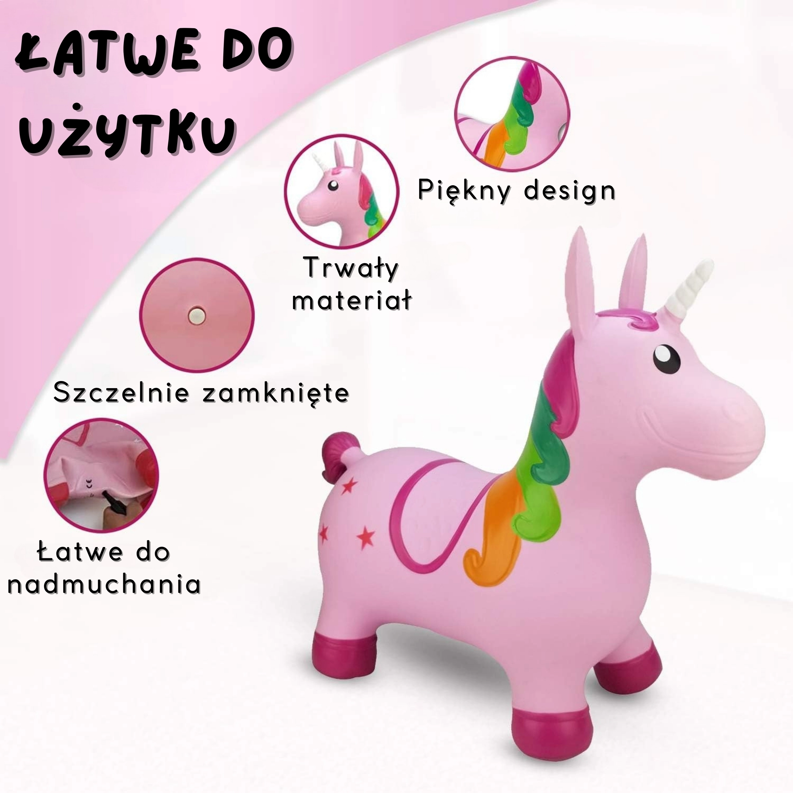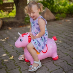 Rozā lēkājošais vienradzis Woopie ir lielisks sabiedrotais aktīvām rotaļām mājās un ārā. Pateicoties ērtajiem rokturiem austiņu formā un platām, neslīdošām kājiņām, braukšana ir stabila un droša. Krāsainā krēpe, baltais rags un zvaigžņu motīvs rosina bērna fantāziju un pārvērš katru brīdi aizraujošā piedzīvojumā.