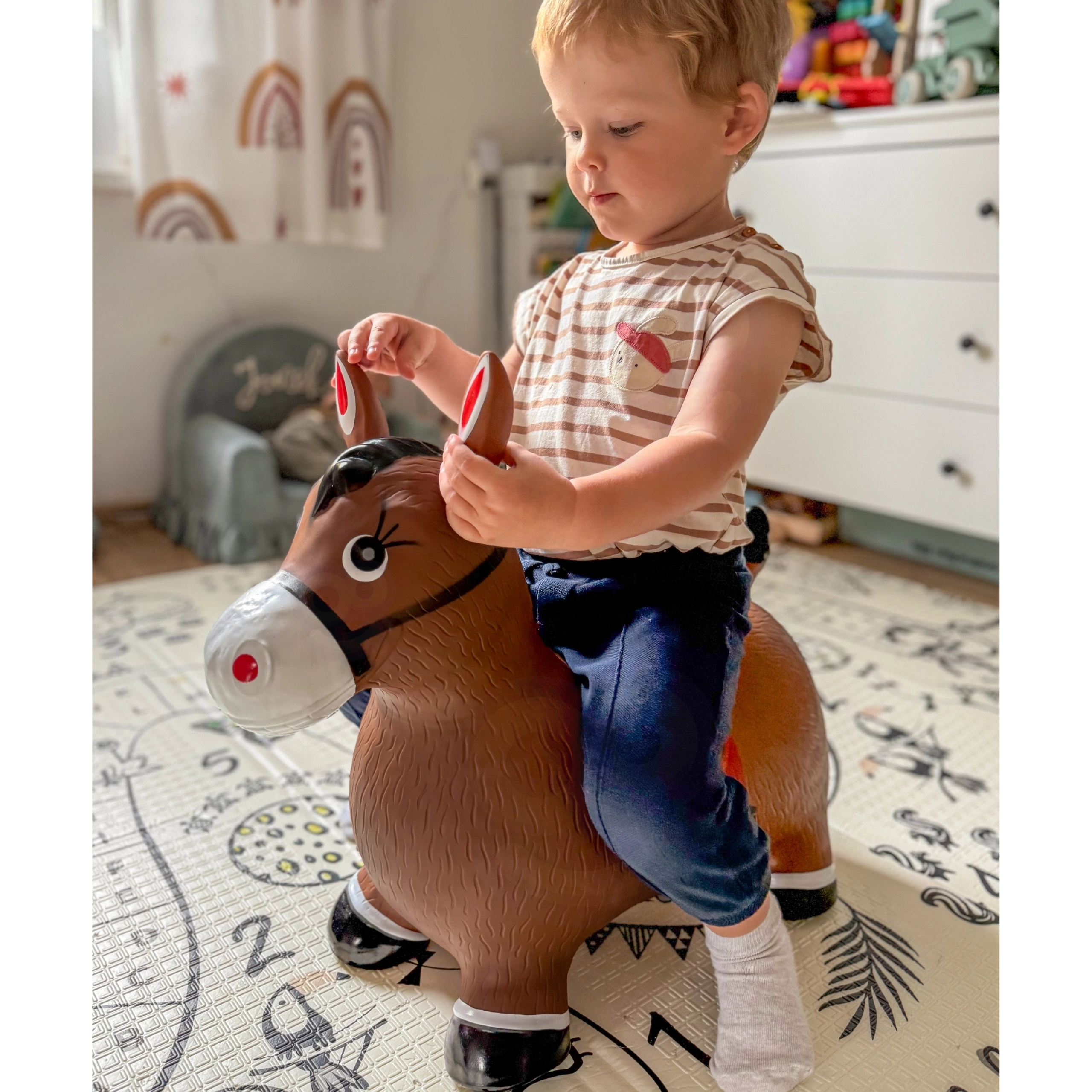 Jauks dizains ar mīlīgu brūnu zirgiņu un segliem rosina rotaļas un attīsta fantāziju. Maksimālā noslodze ir 45 kg, bet ieteicamais spiediens 0,3–0,4 bar nodrošina pareizu elastību ērtai lēkāšanai. Komplektā ir praktisks pumpis, lai jautrība varētu sākties uzreiz pēc izpakošanas.