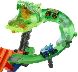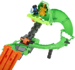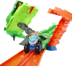 Uzsāc adrenalīna pilnu dueli tematiskajā komplektā “Haizivis pret dinozauriem: Pūķa sacīkstes”. Ievieto abus kravas monstrus dubultajā palaidējā un sūti tos paralēlajās sacīkstēs tieši kiberpūķa rīklē. Par visu izšķir zāģveida pārslēgs, kas nejauši nosaka, vai transportlīdzekļi apstāsies, viens nokritīs no trases vai abi izlauzīsies cauri un gāzīs pūķi pie zemes.