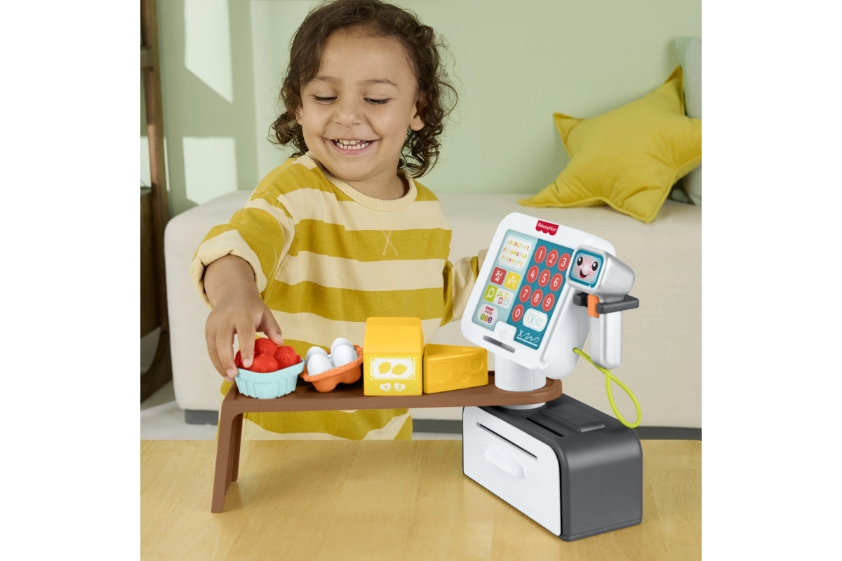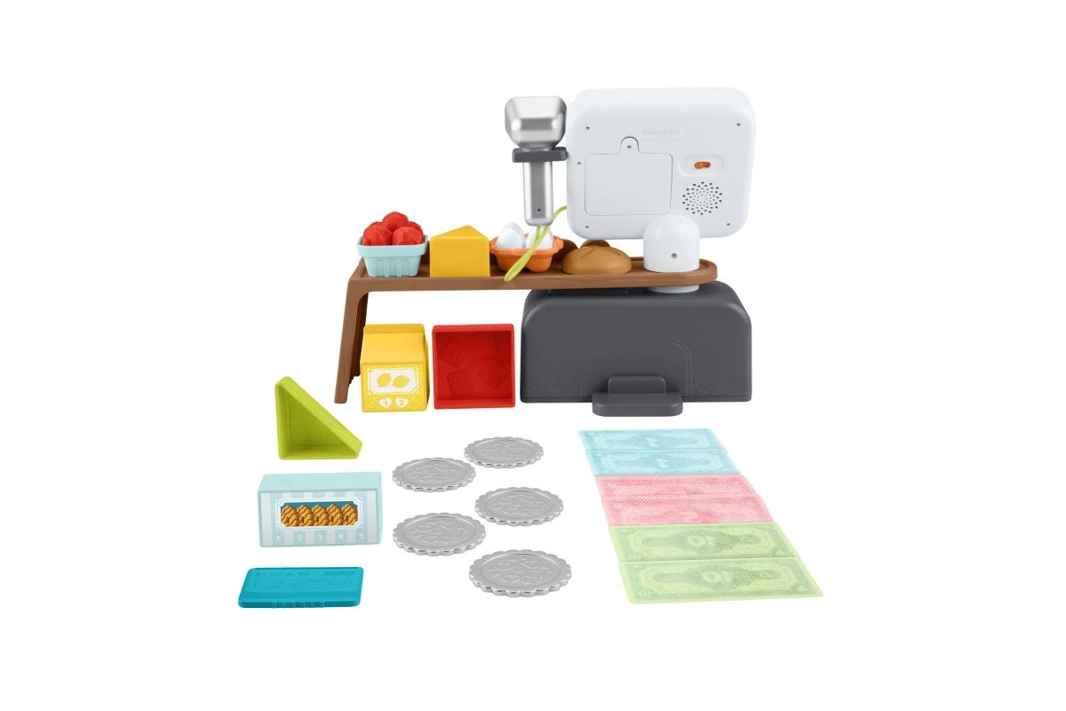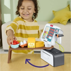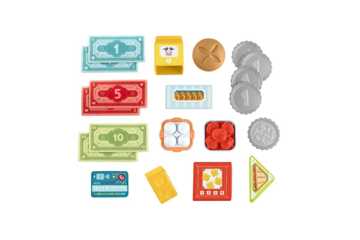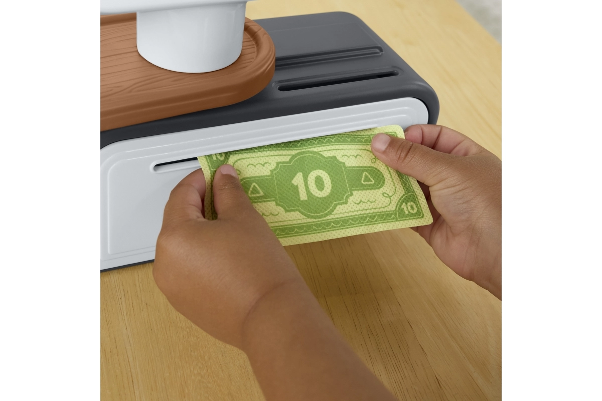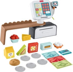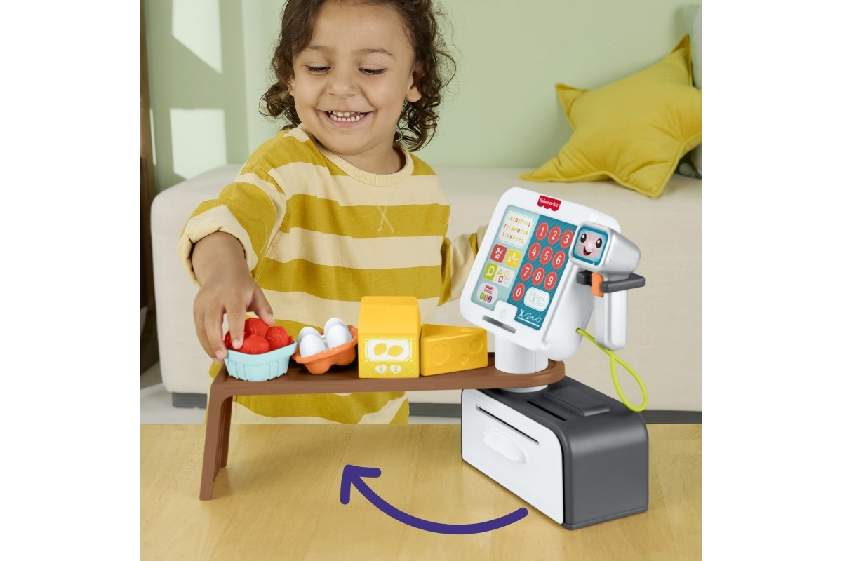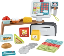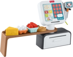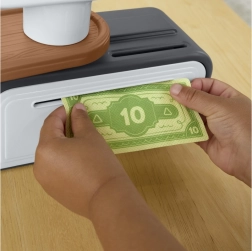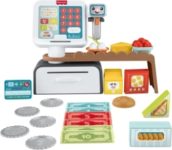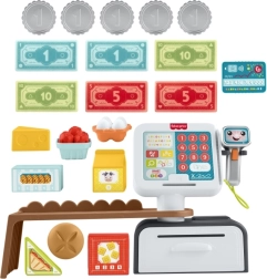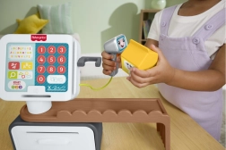 Runājošā Fisher‑Price kase pārvērš katru veikala spēli aizraujošā mācību piedzīvojumā. Bērni var skenēt pārtikas produktus, spiest lielas, krāsainas pogas, ielikt banknotes un monētas atvilktnē un maksāt ar karti. Bagātīga skaņas atgriezeniskā saite ar vairāk nekā 150 skaņām un frāzēm veicina dabisku mācīšanos un vārdu krājuma attīstību.