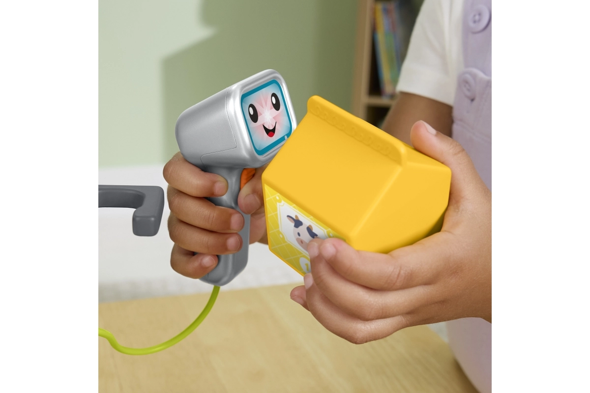 Bērni skenē preces ar smaidīgo rokas skeneri, spiež pogas un atver kases atvilktni – gluži kā īstā veikalā. Attīsta motoriku un reālistisku lomu spēli.