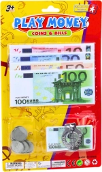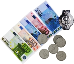 Iepakojumā atradīsiet krāsainas dažādu vērtību banknotes un plastmasas monētas ar centu un eiro apzīmējumiem. Viss ir iesaiņots krāsainā blistera iepakojumā ar euro-āķa piekari, kas atvieglo produkta glabāšanu un izvietošanu. Šis komplekts ir ideāli piemērots spēlei mājās, veikalā vai restorānā, kā arī lieliski der kā didaktisks līdzeklis bērnudārzos un sākumskolās.