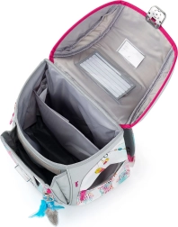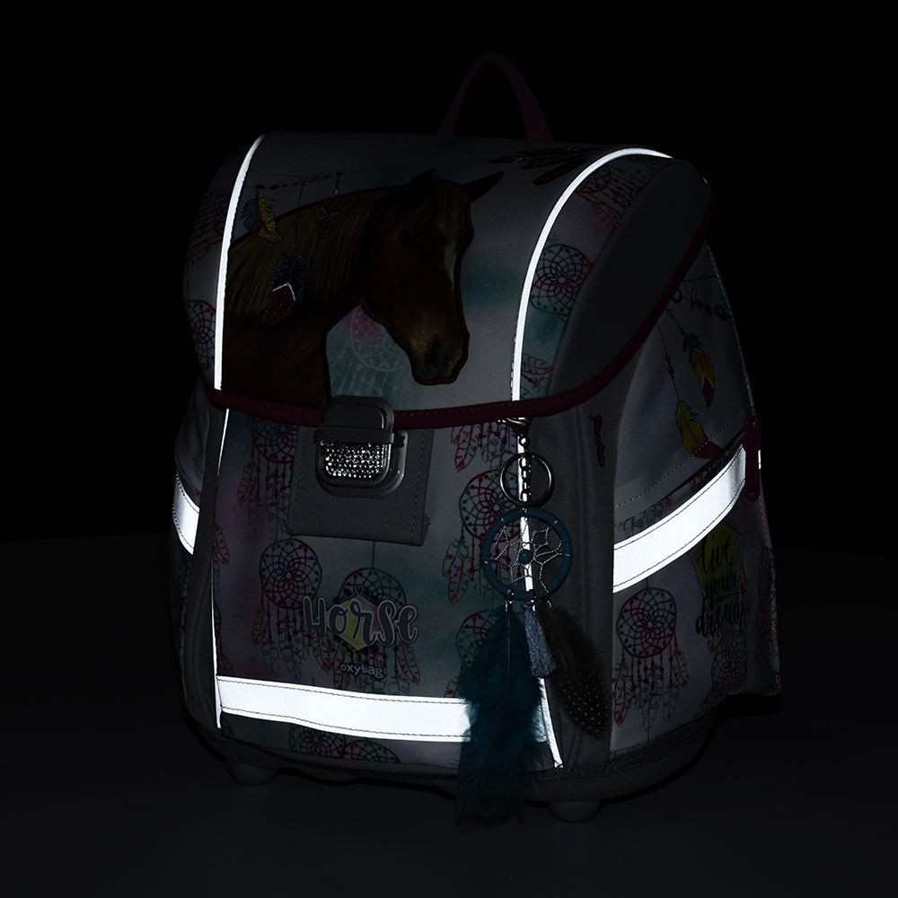Premium Light sērijas skolas mugursoma ar elegantu zirga motīvu piedāvā vairāk nekā tikai skaistu izskatu. Tā izgatavota no viegla materiāla, tāpēc sver mazāk nekā 900 g. Mugursomai ir ērts, elpojošs polsterējums un platas polsterētas lences, kas vienmērīgi sadala svaru uz bērna pleciem. Papildu ērtībai ir pievilkšanas siksnas un krūšu siksna.