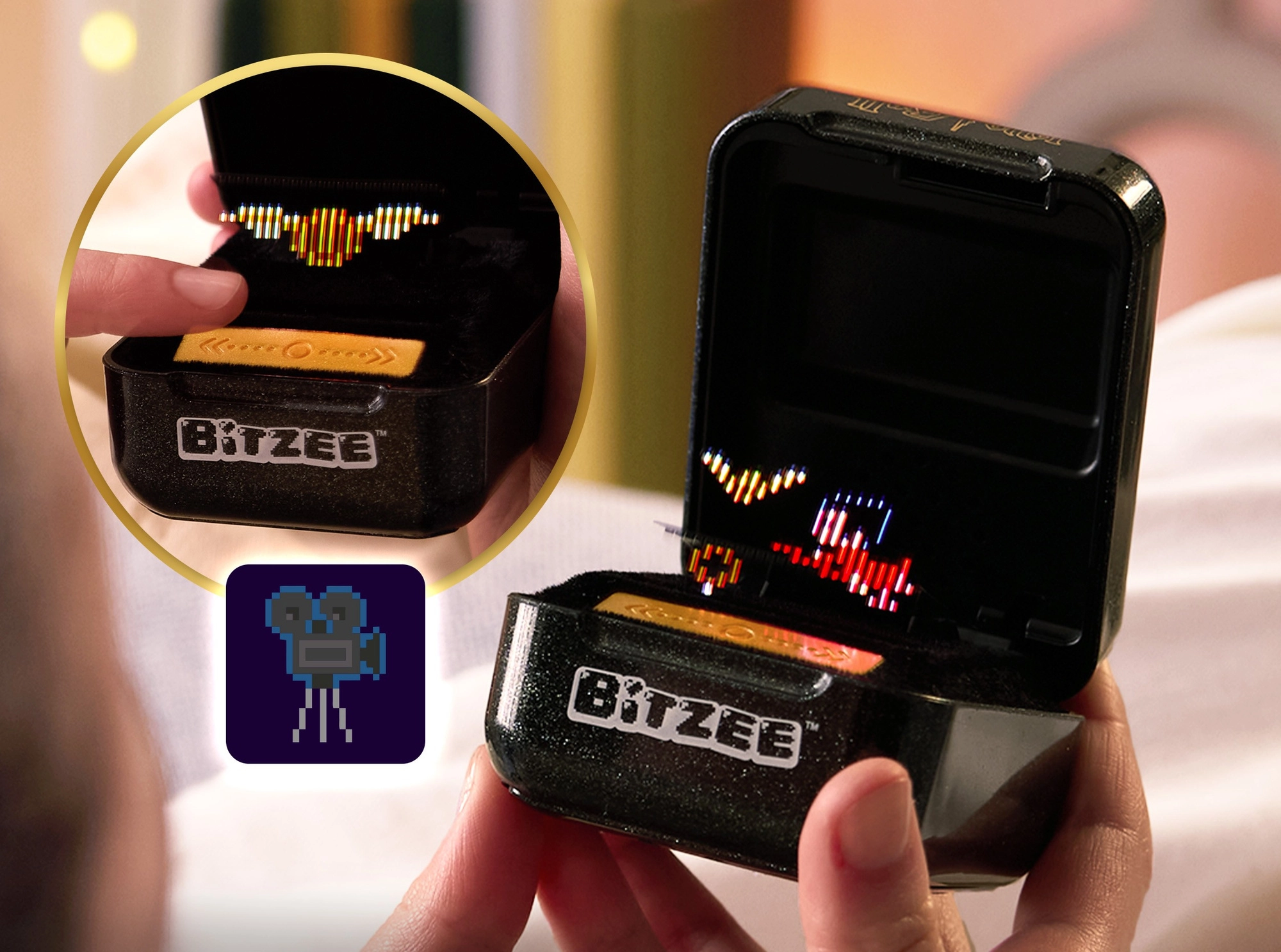 Bitzee HARRY POTTER ir stilīga melni zelta kapsula ar Hogwarts ģerboni, kas atdzīvojas, pateicoties unikālam hologrāfiskam attēlojumam. Tā reaģē uz pieskārieniem, pārbīdi, slīpināšanu un kratīšanu un apbalvo ar burvīgiem skaņas efektiem un animācijām. Katrs žests virza spēli uz priekšu un sniedz jaunus varoņus un piedzīvojumus, iedvesmotus no filmām.