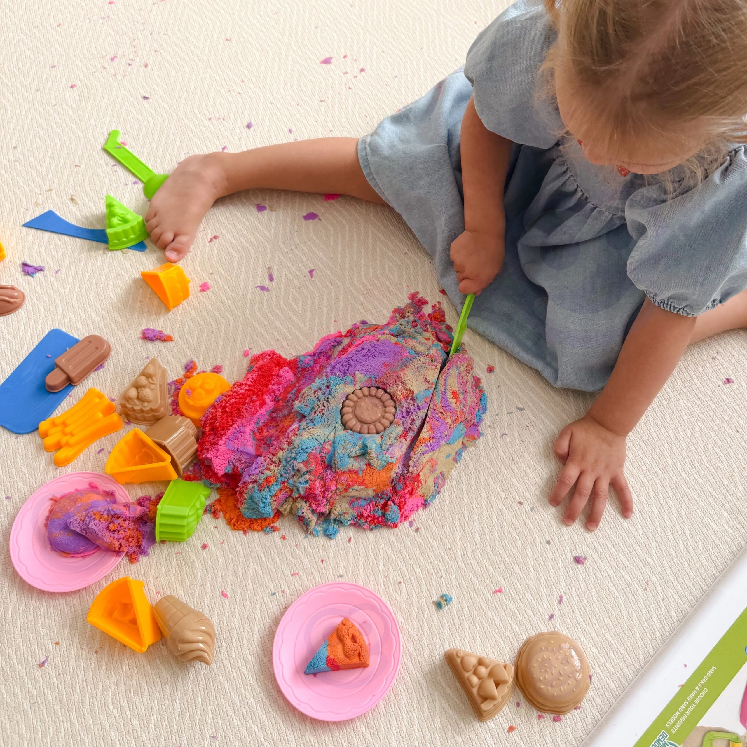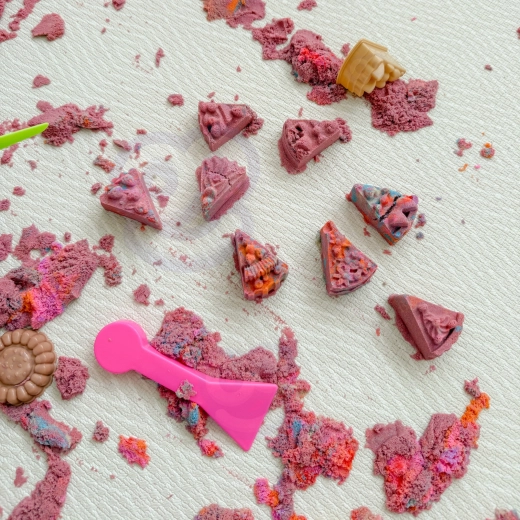 Smilšu īpašais sastāvs ir patīkams pieskārienam, tās viegli griezt, rullēt un presēt formiņās, turklāt tās neizžūst un saglabā formu. Bērni var “gatavot” un servēt desertus uz šķīvīšiem, izmantot lāpstiņas, nažiņus un rullīti, kā arī veidot detalizētas tekstūras ar presēšanas piederumiem.