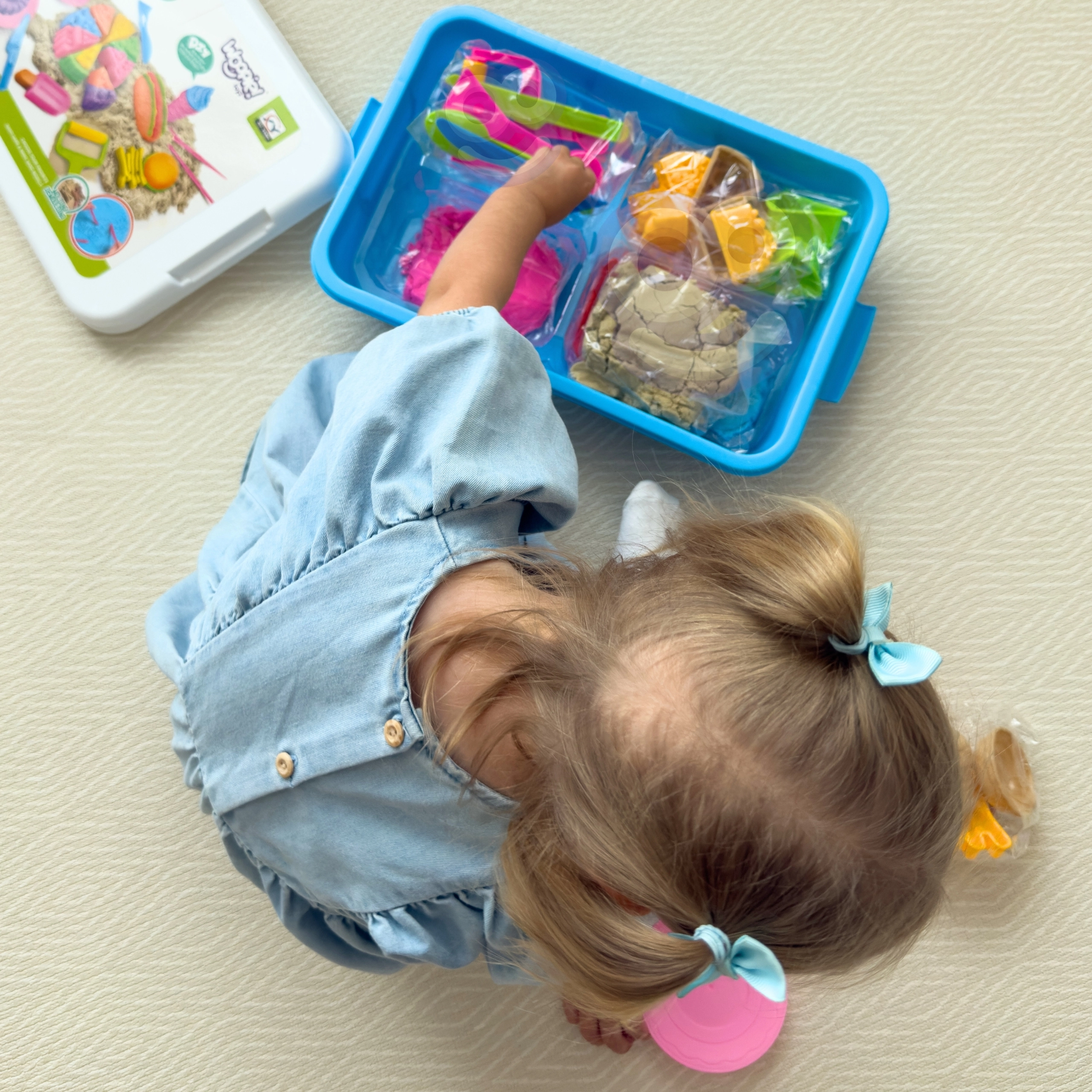 - Koferītis/galdiņš, kinētiskās smiltis 6 krāsās (1,2 kg), formiņas (saldējums, hotdogs, cepumi, mafini u.c.), rīki (lāpstiņas, nažiņi, rullītis), presēšanas piederumi, šķīvīši un piederumi
