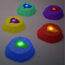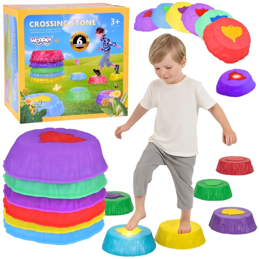 Woopie spīdošo akmeņu komplekts ir paredzēts bērniem no 3 gadu vecuma un sniedz daudz jautrības. Šie akmeņi iedegas, kad uz tiem tiek izdarīts spiediens vai tie tiek kustināti, un tie ir stabili uz dažādām virsmām, piemēram, paklāja, grīdas vai zāles.