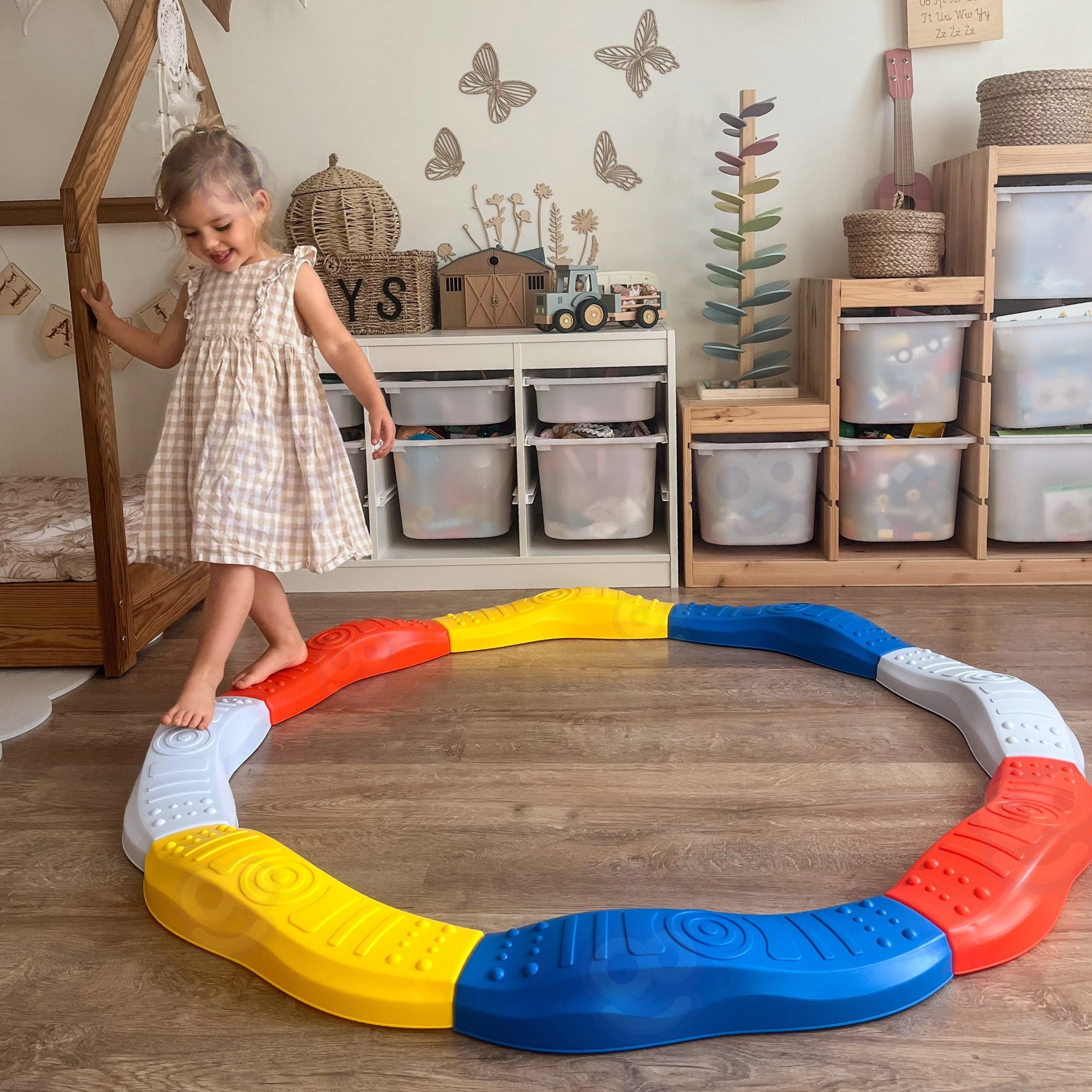 Izveidojiet apli ar diametru ap 130 cm, līkumainu “čūskas” taku vai mazākus apļus. Trase ir piemērota bērnu istabai, spēļu telpai un dārzam – nepieciešama tikai līdzena virsma. Lieliski attīsta rupjo motoriku, propriocepciju un sniedz aizraujošu līdzsvara treniņu gan basām kājām, gan ar zeķēm.