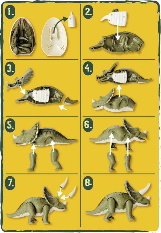 - Dinozaura figūriņa – trīs veidos: T‑Rex, Velociraptors vai Triceratops