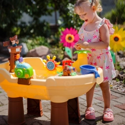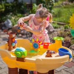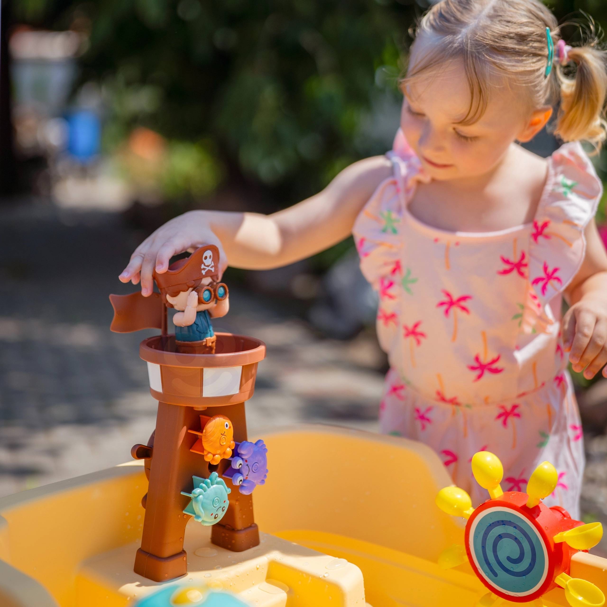 Tornis ar pirātu, slidkalniņš un ūdens riteņi reaģē uz ūdens liešanu. Bērni atklāj cēloņsakarības, trenē motoriku un attīsta iztēli.