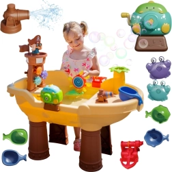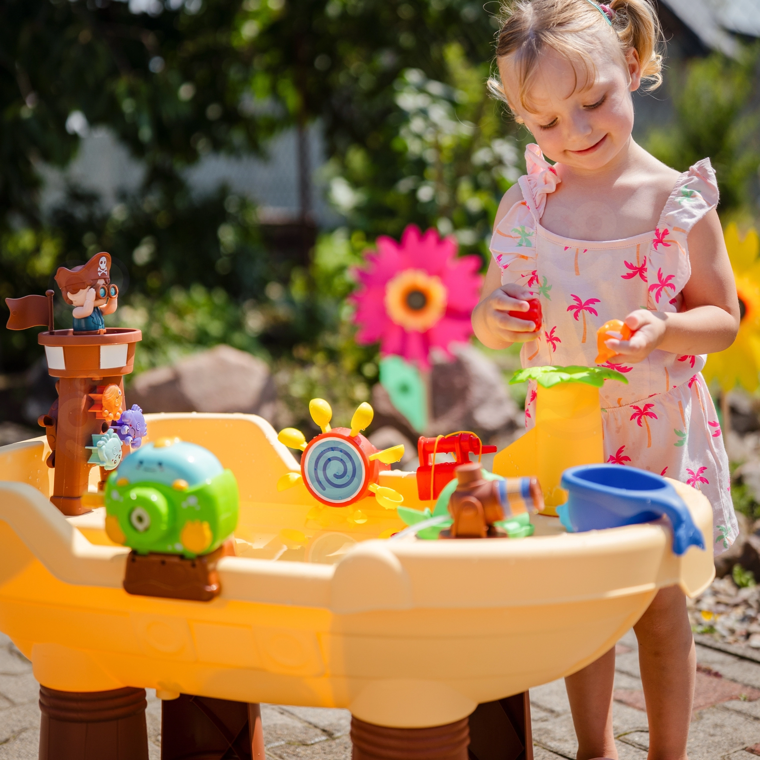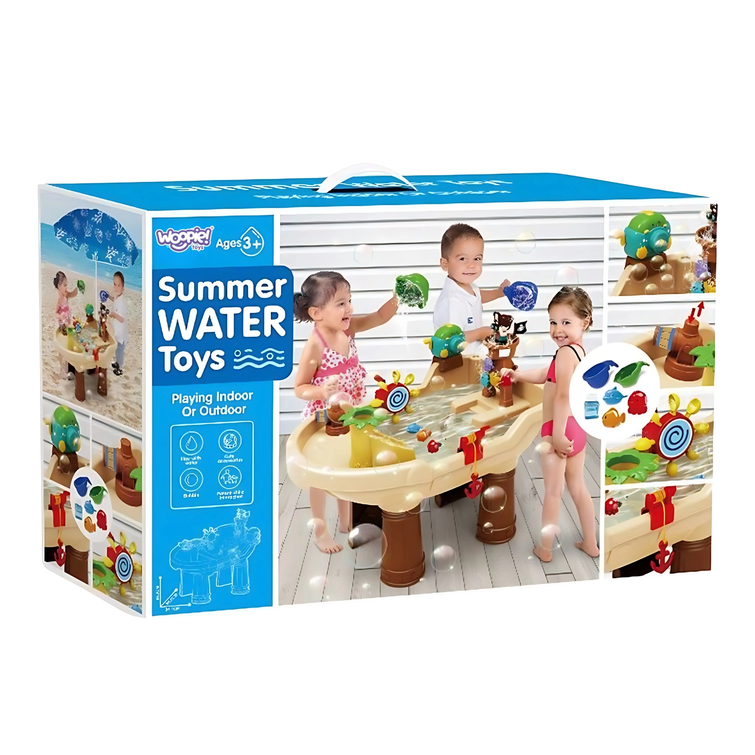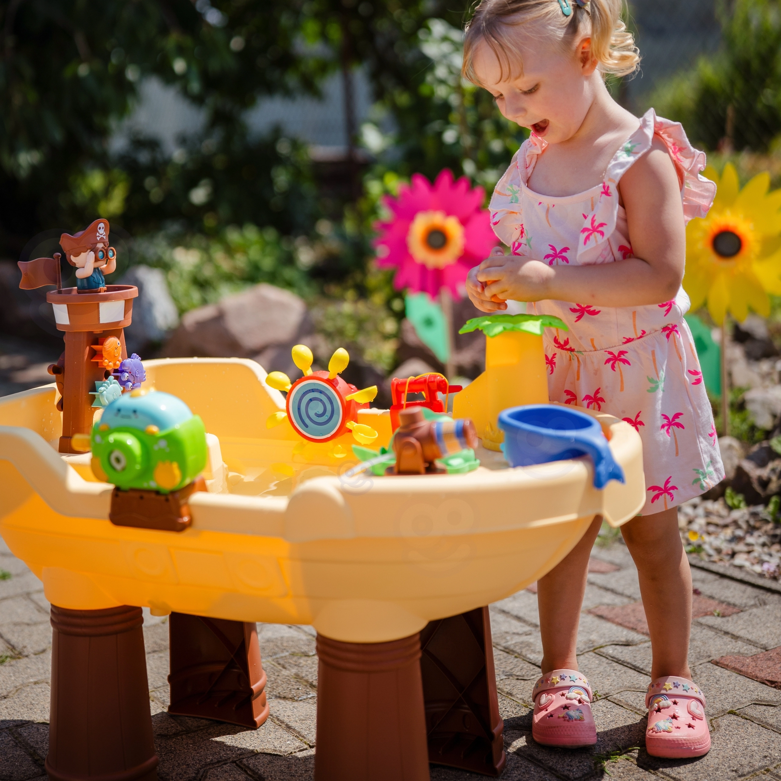 Woopie ūdens un smilšu galds pirātu kuģa formā pārvērš pagalmu piedzīvojumu līcī. Bērni var šaut ūdeni no lielgabala, laist to pa slidkalniņu, griezt mazus un lielus ūdens riteņus un pūst ziepju burbuļus. Pateicoties stabilām kājām un kvalitatīvam plastmasam, galds ir izturīgs, drošs un piemērots ikdienas spēlei.
