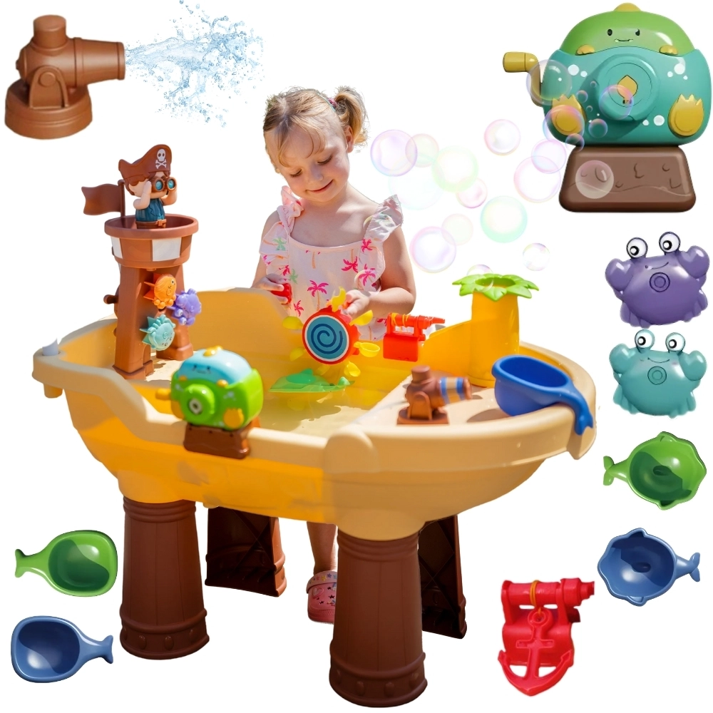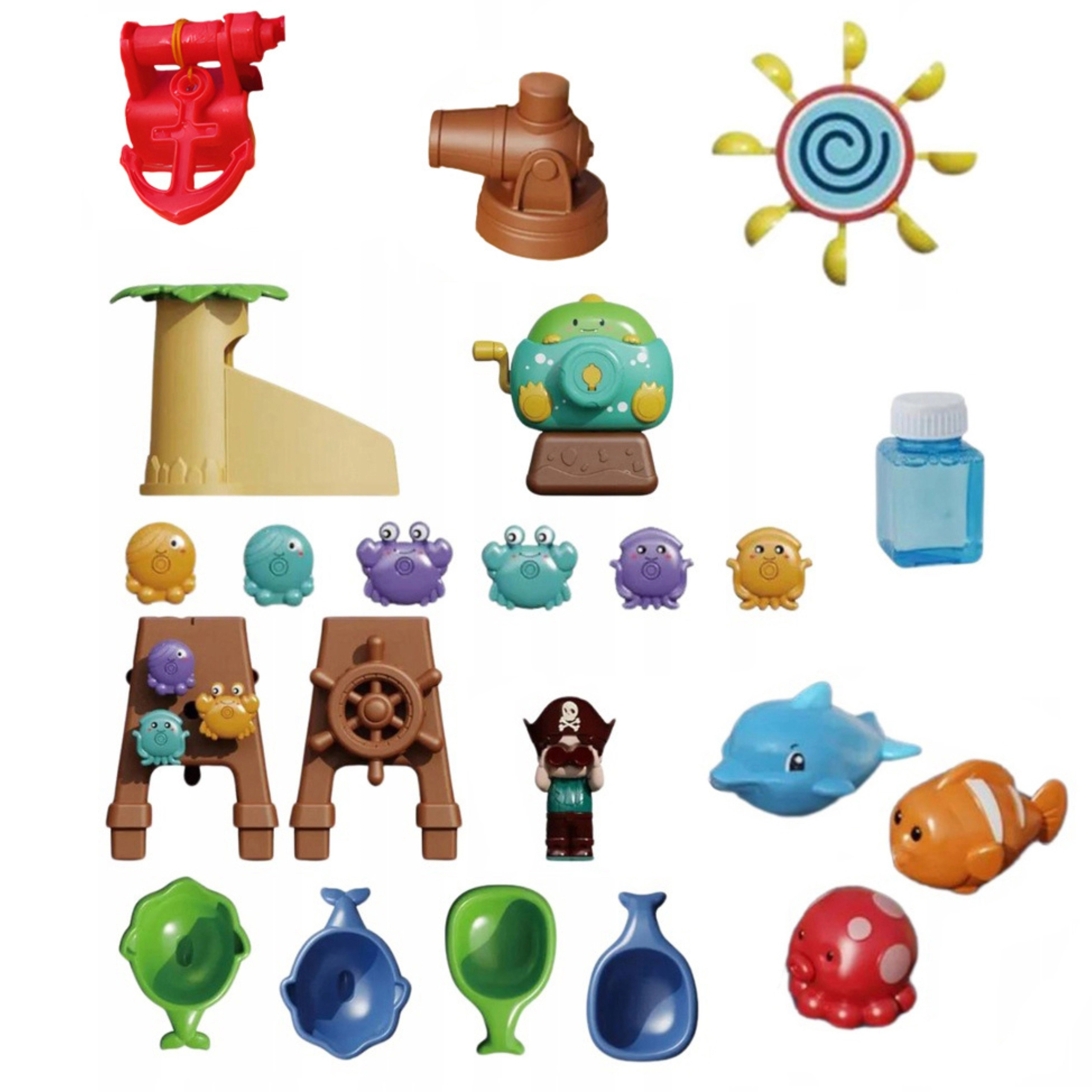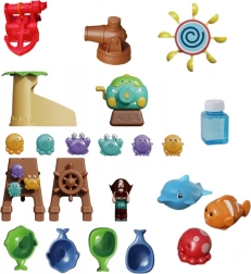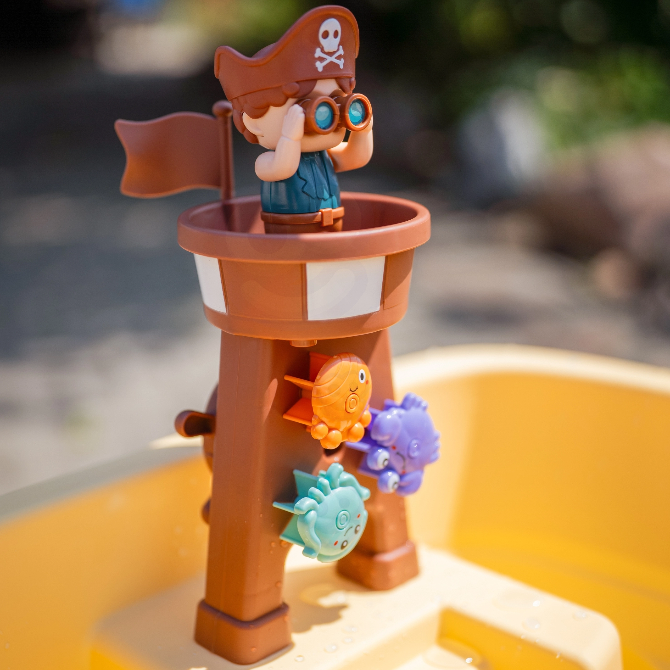 Komplektā ietilpst pirātu tornis ar novērošanas ligzdu, pirāta figūriņa, enkurs, kausiņi liešanai un peldoši dzīvnieciņi, kas veicina maņu rotaļu, acu-roku koordināciju un radošumu. Lielā vieta ļauj ērti spēlēties vairākiem bērniem vienlaikus, bet vienkāršā uzbūve atvieglo ūdens nolaišanu un kopšanu.