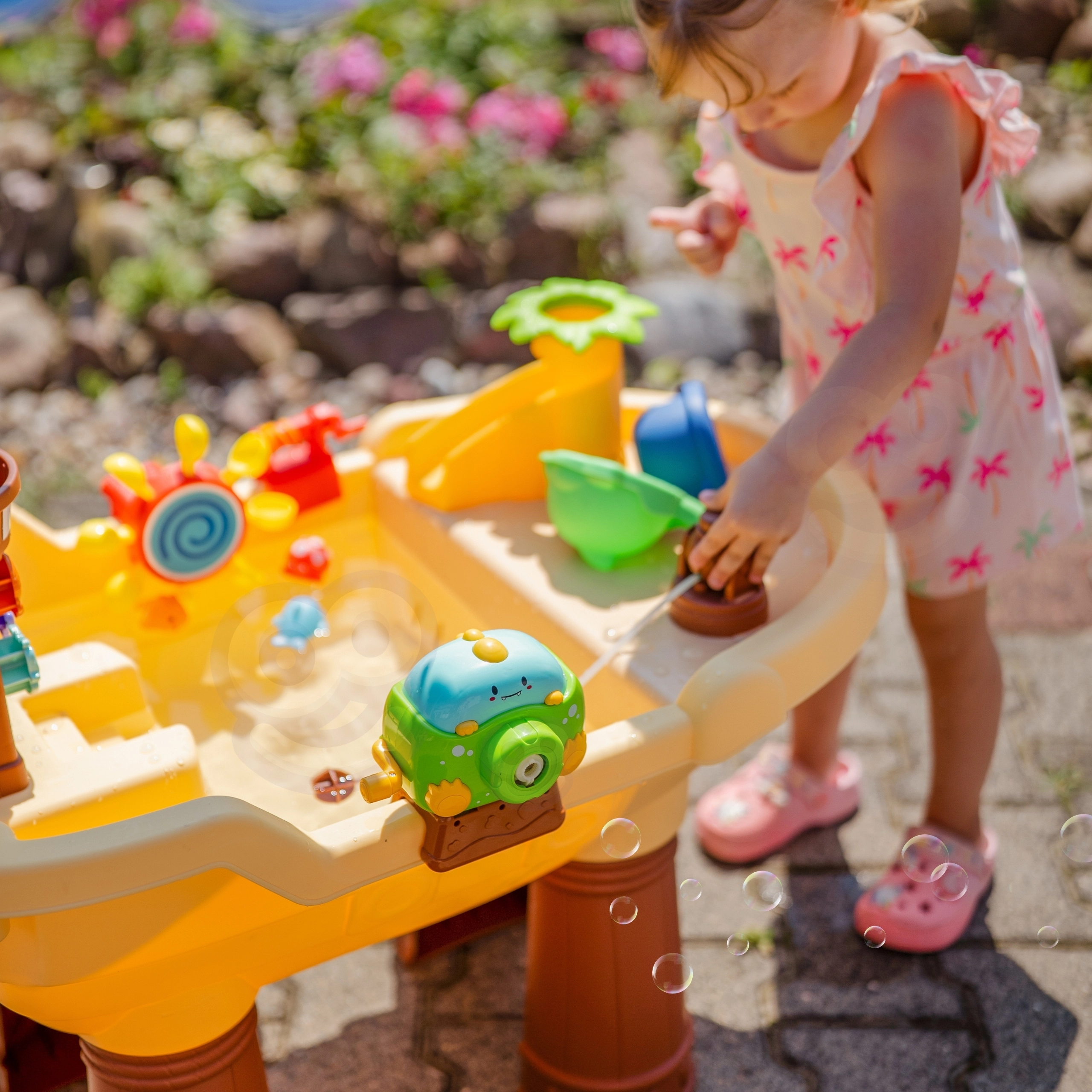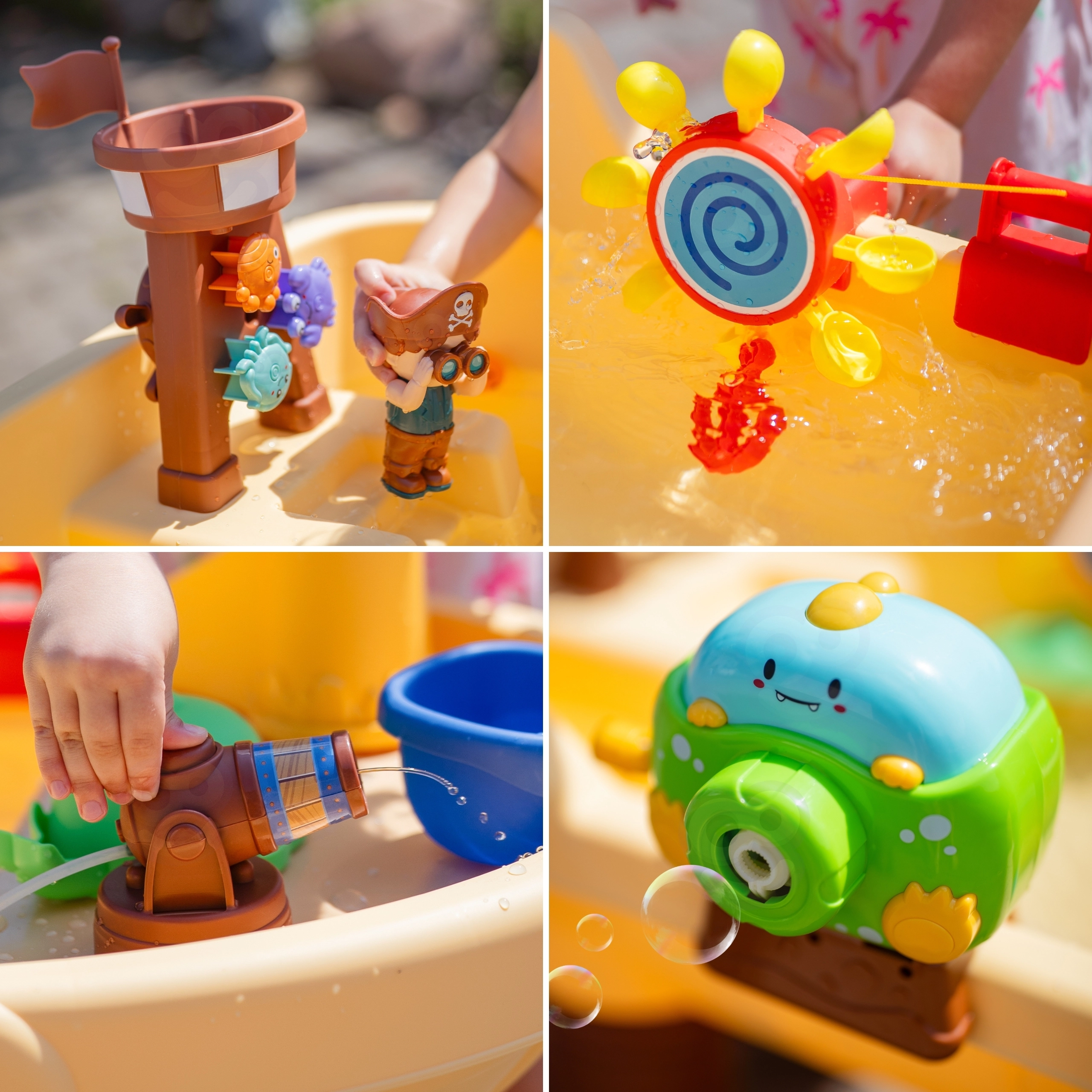 Integrētais ziepju burbuļu pūtējs un ūdens lielgabals pārvērš spēli pirātu šovā. Bērni var šļakstīt, pūst un vērot burbuļus un plūstošu ūdeni.