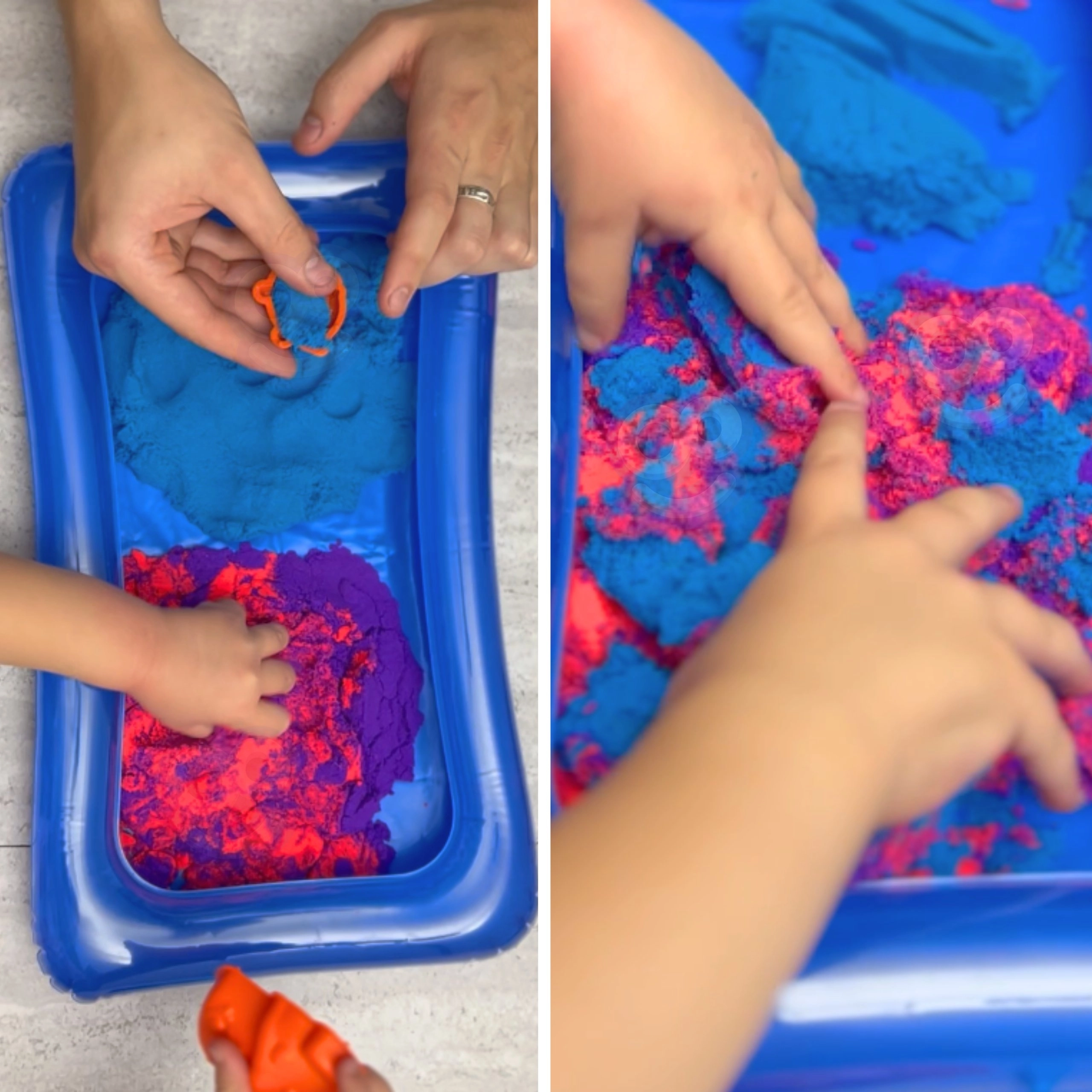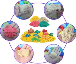 Kinētiskās smiltis ir maigas pieskārienam, lieliski notur formu, nelīp pie rokām un neizžūst – ideāli ilgstošai spēlei.
