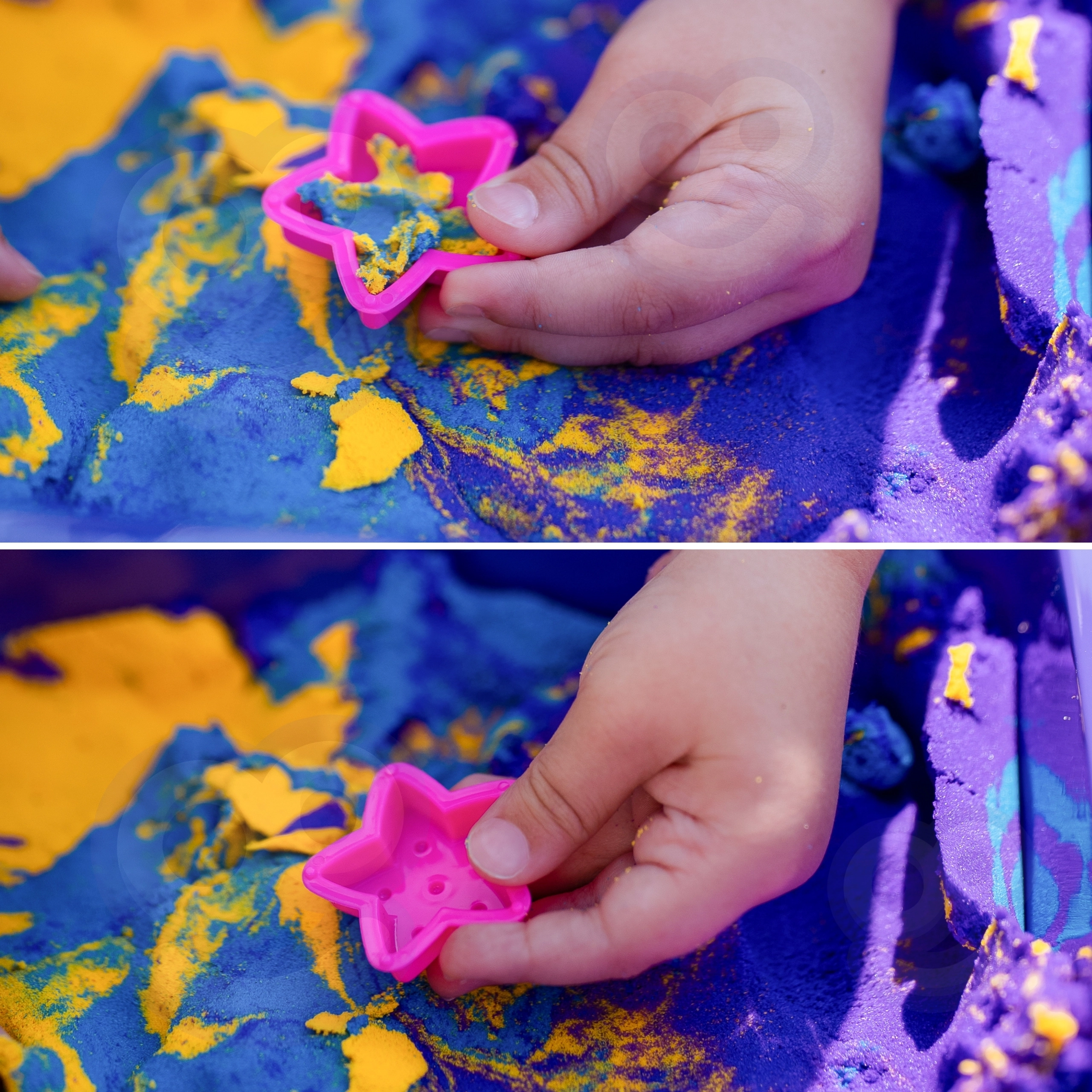 Bērni var spiest, griezt un veidot smiltis zvaigznītēs un citos motīvos. Lieliski piemērots sensorai spēlei un sīkās motorikas attīstīšanai.