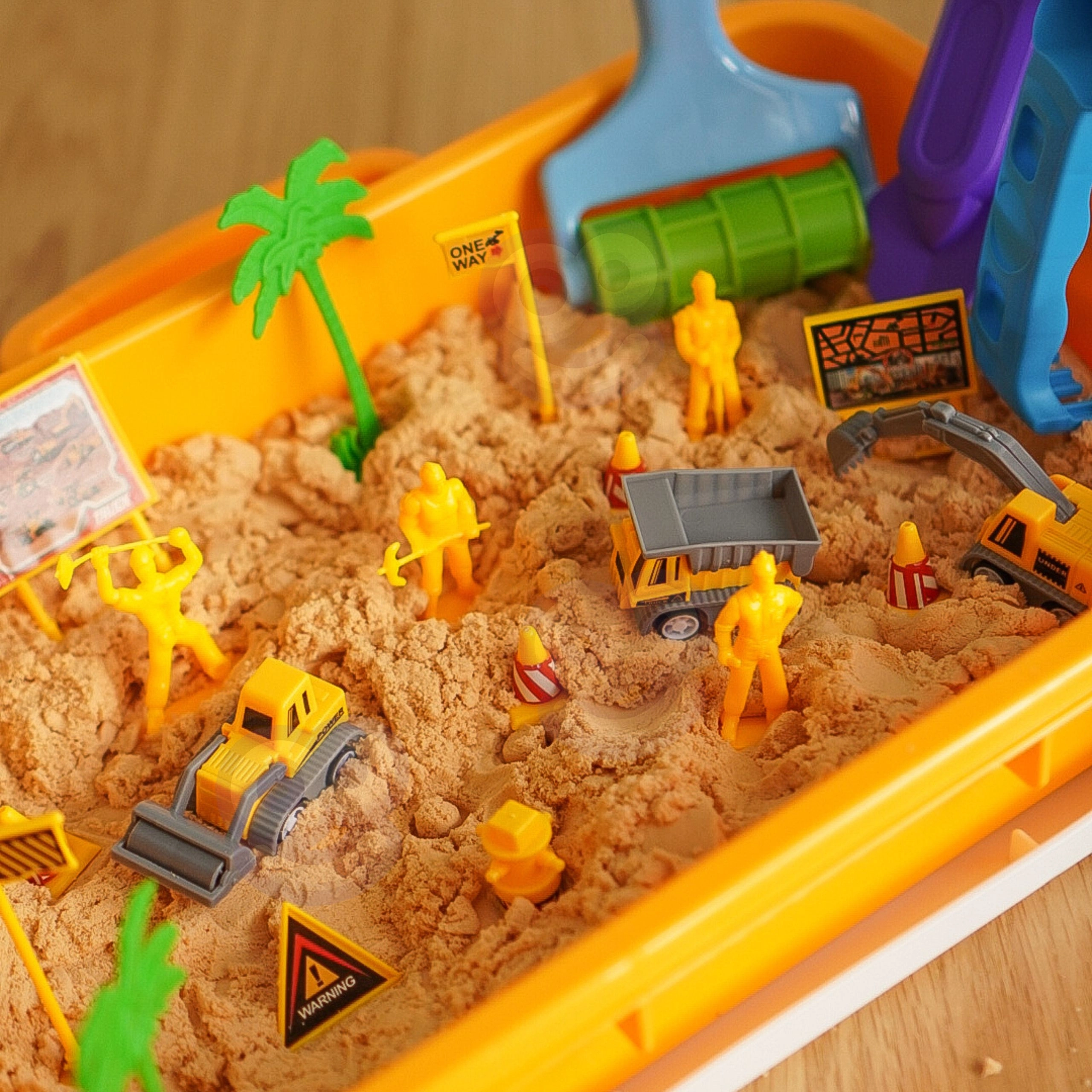 - Iepakojuma saturs: apm. 1500 g kinētisko smilšu, pārnēsājama kaste/paplāte, būvniecības transportlīdzekļi, figūriņas, ceļa zīmes, konusi, palmas, instrumenti un formiņas, uzlīmes.