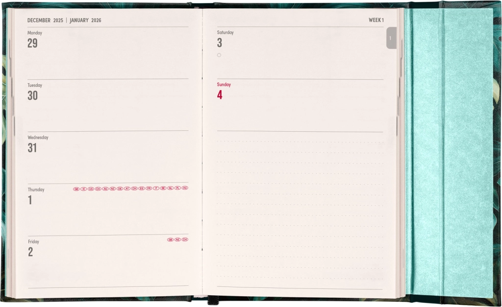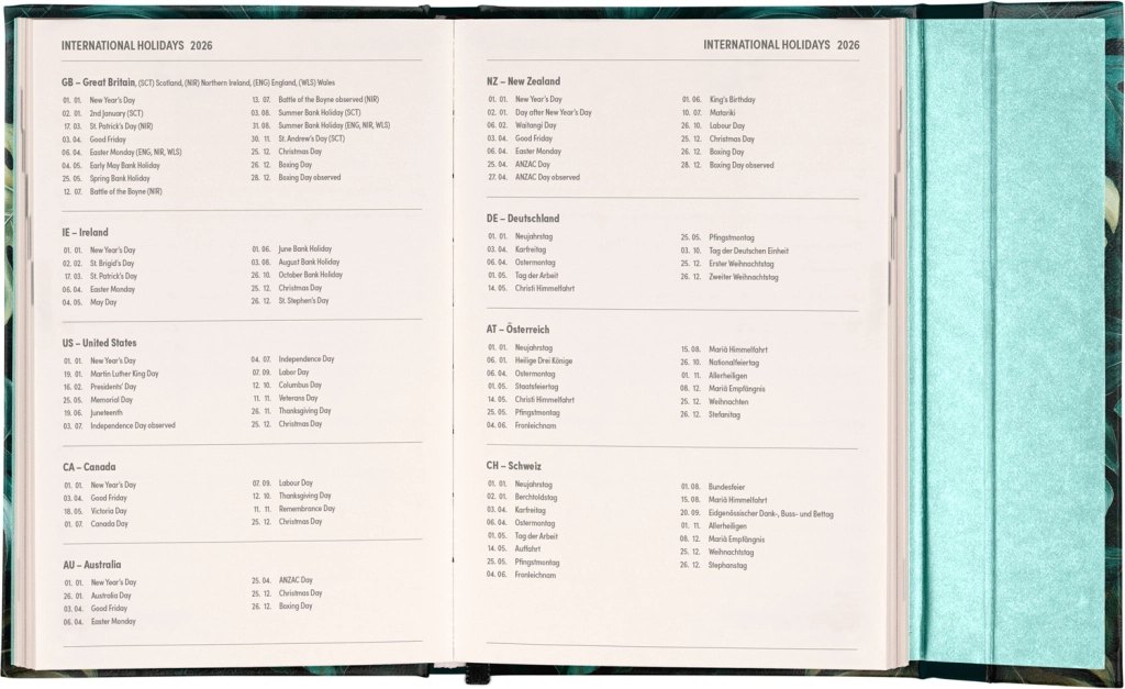 Nedēļas plānotājs ar magnētisku aizdari un tekstiem angļu valodā ir lieliska izvēle tiem, kuri vēlas savus plānus pārskatāmi turēt kontrolē. Nedēļas pārskats divās lappusēs un starptautiskie svētki nodrošina ērtu pamatu ikdienas plānošanai.