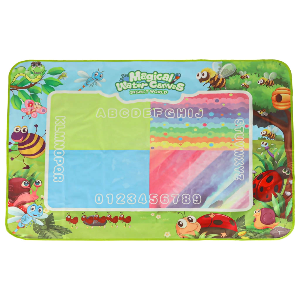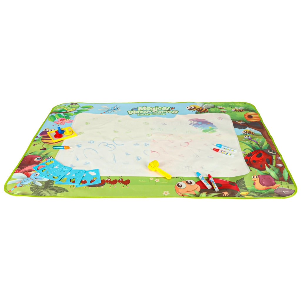 Izklaidējošs ūdens zīmēšanas paklājs mazajiem māksliniekiem. Komplektā ir viss, kas vajadzīgs radošai spēlei bez nekārtības, tostarp ūdens marķieri, spiedogi un šabloni.
