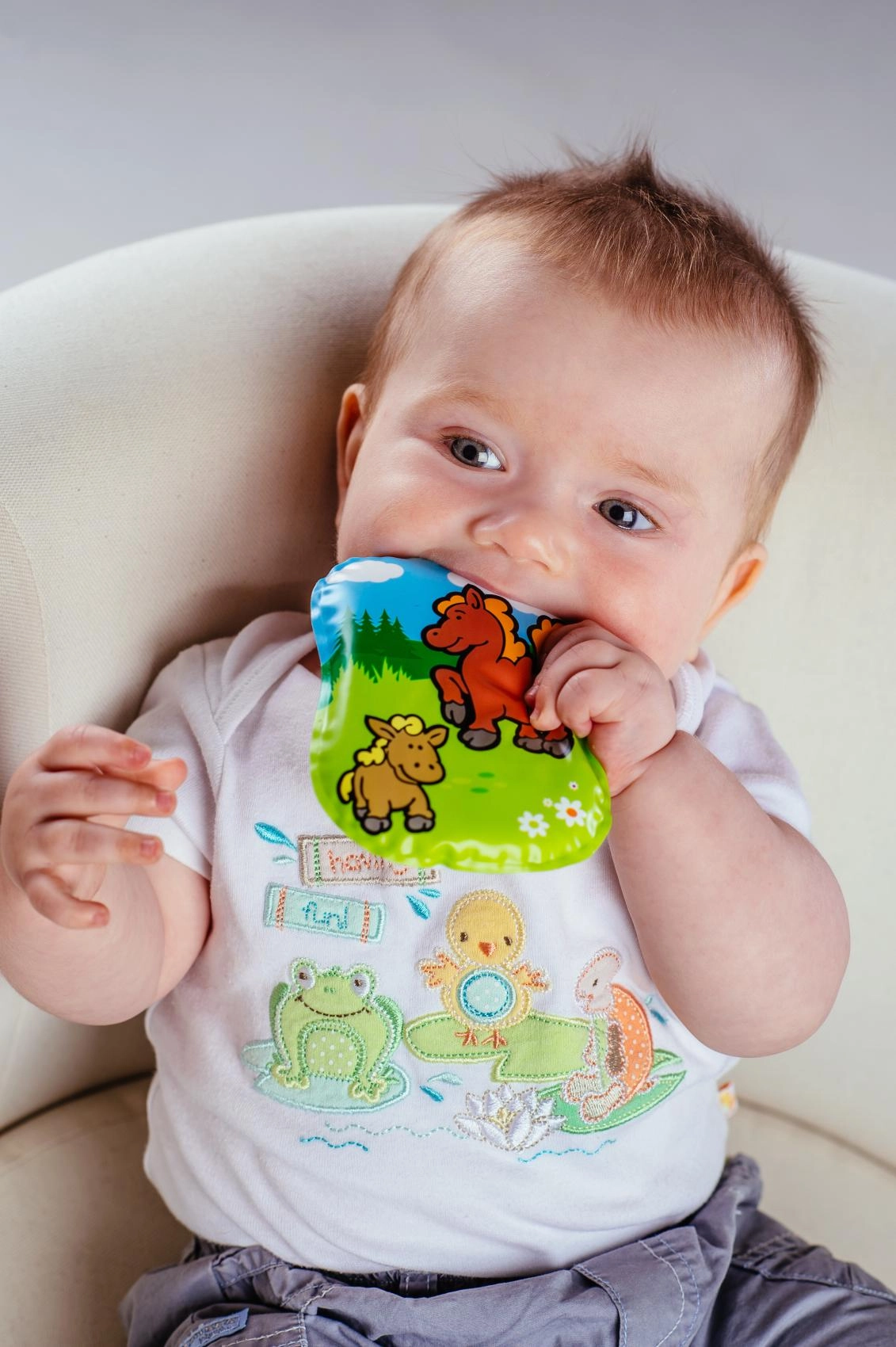 Spilventiņš izgatavots no drošiem materiāliem bez ftalātiem un ir sertificēts lietošanai no dzimšanas. Pieejami vairāki mīlīgi dzīvnieciņu motīvi, kas veicina vizuālo stimulāciju un pirmo iepazīšanos.