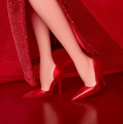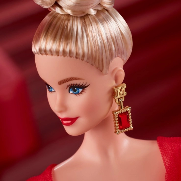 - Rubīnsarkanās augstpapēžu kurpes papildina viņas iespaidīgo izskatu, bet zelta auskari ar “M” motīvu atsaucas uz tradicionālo Mattel logotipu.