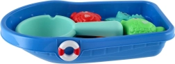 Zilā laiviņa stabili pelda un var uzņemt citus gabaliņus. Bērni ar to var pārvadāt dzīvnieciņus, smelt ūdeni un izdomāt savus stāstus.