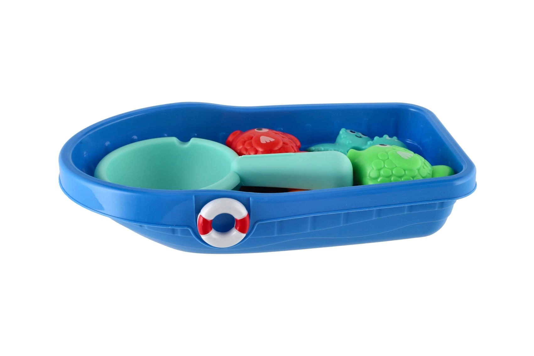 Šis krāsainais ūdens spēļu komplekts sniedz bērniem daudz smieklu un mācīšanās iespēju. Izturīgā plastmasas laiviņa pelda uz ūdens virsmas, sietiņš ar atverēm ir lielisks ūdens lēšanai un sijāšanai, bet mīlīgie jūras dzīvnieciņi aicina ķert un šķirot pēc formām un krāsām.