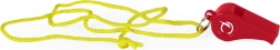 Sarkana plastmasas svilpe, piestiprināta pie dzeltenas aukliņas, ideāli piemērota signalizācijai vai sportiskām aktivitātēm.