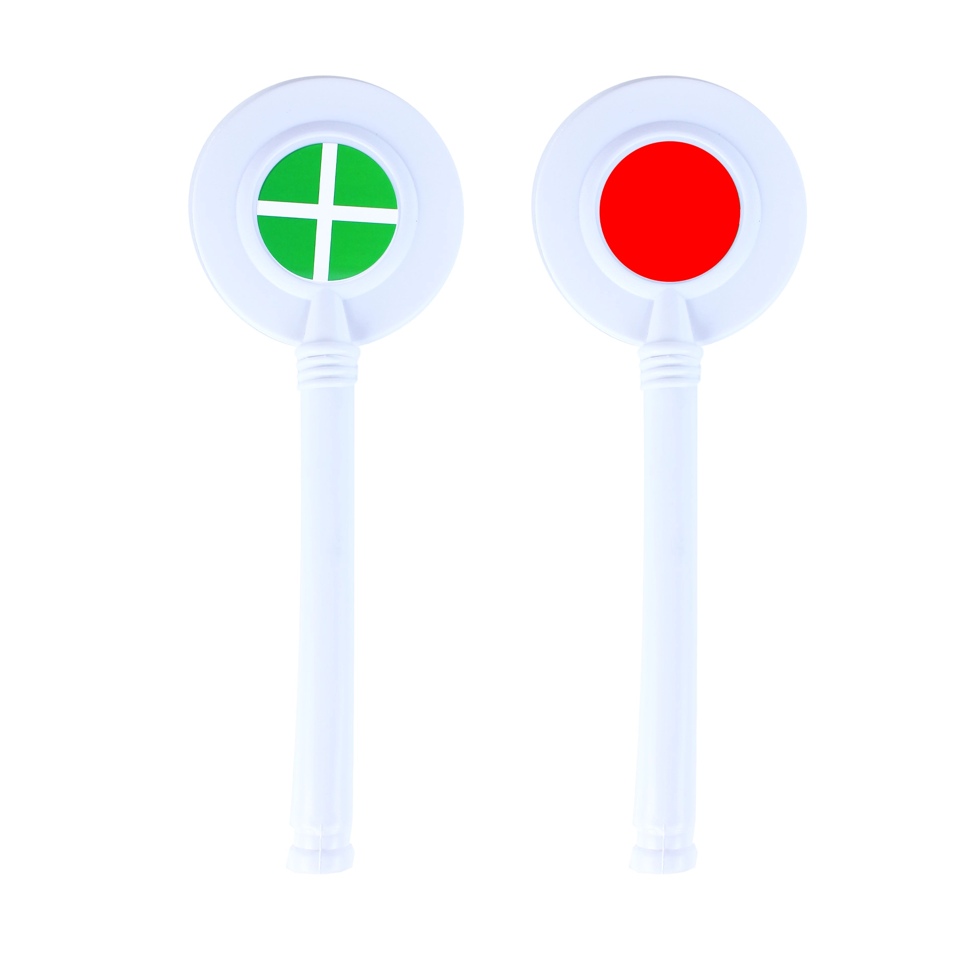 Divi plastmasas riņķi ar gariem baltiem rokturiem: viens ar zaļu apli un otrs ar sarkanu. Lieliski piemēroti spēlei un signalizācijai treniņu laikā.