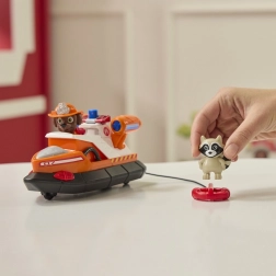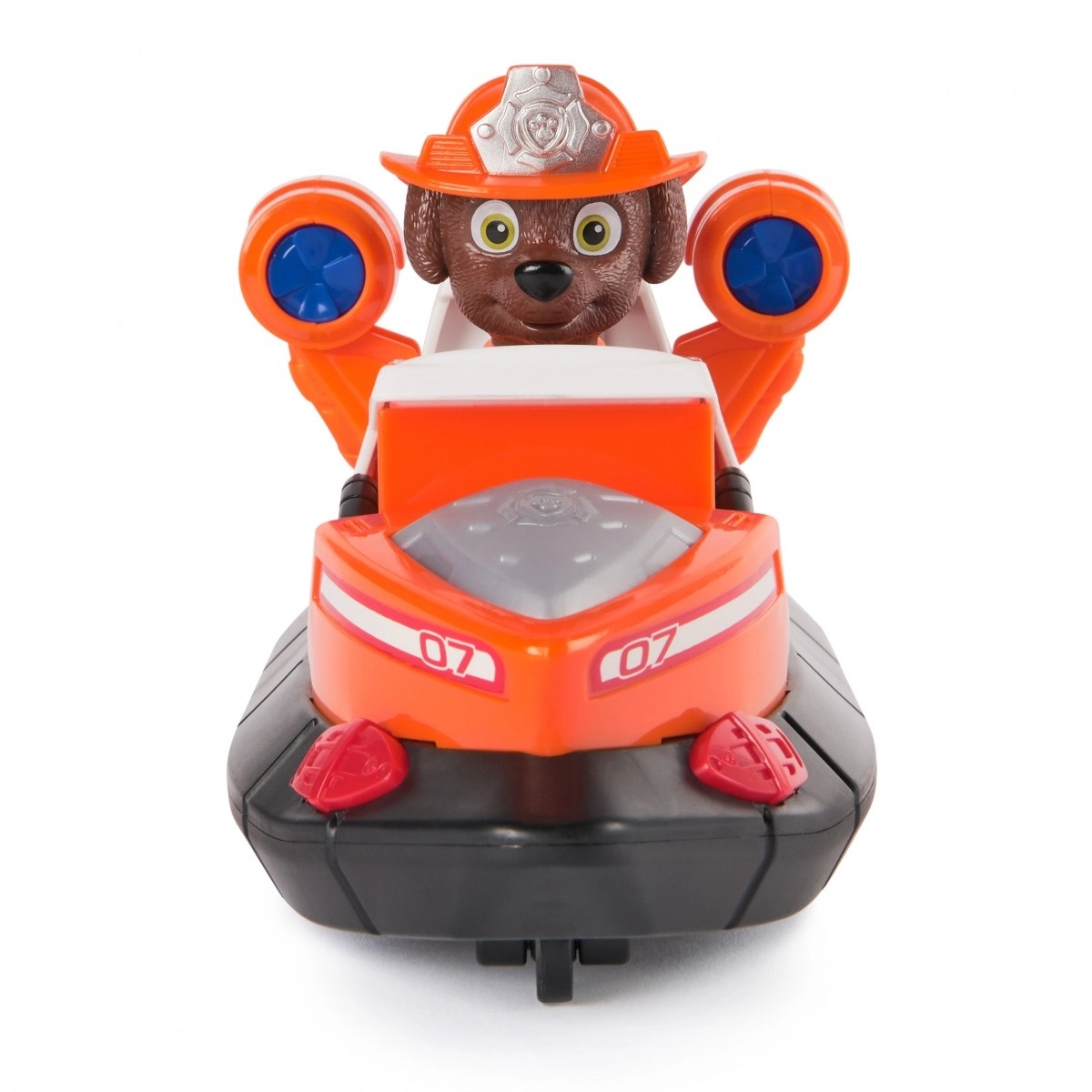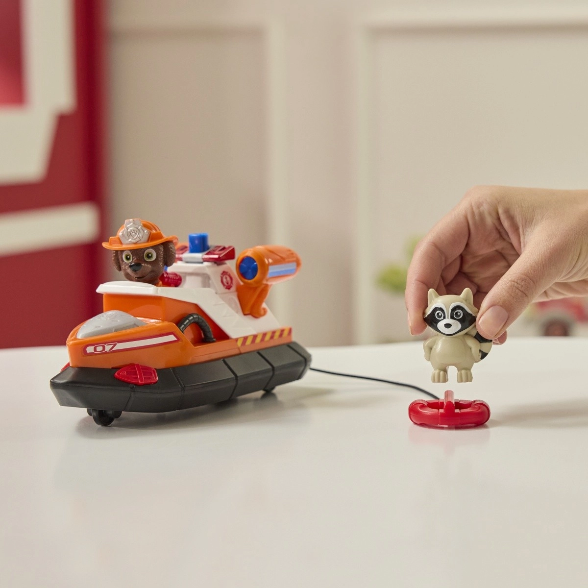 Zuma, vairāk nekā 5 cm augsts savā ugunsdzēsēja tērpā, ir gatavs glābt situāciju. Ugunsdzēsēju laiva ir aprīkota ar glābšanas riņķi, kas piestiprināts pie auklas, nodrošinot daudz dinamisku piedzīvojumu. Zumu papildina arī mazs jenots, kuru var izglābt. Bērni var nospiest pogu, lai izšautu glābšanas riņķi, kurā jenots perfekti ietilpst. Pateicoties oriģinālajam Paw Patrol stilam, šī rotaļlieta izskatās tieši kā seriālā un iedvesmo bērnus piedzīvojumiem.