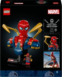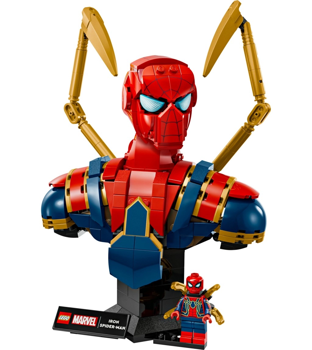 Ienirsti supervaroņu pasaulē ar detalizētu Iron Spider-Mena krūšutēla modeli. Šis augstākās klases komplekts pieaugušajiem apvieno pievilcīgu sarkano, zilo un zelta bruņu izskatu ar smalkām niansēm, tostarp divām artikulētām mehāniskām rokām un pagriežamu galvu. Komplektā ietilpst arī Iron Spider-Mena minifigūriņa un divi maināmi pamatnes statīvi ar nosaukumu plāksnīti – viens ar vietu minifigūriņai un viens bez.