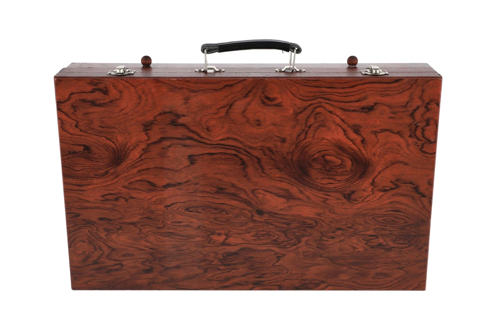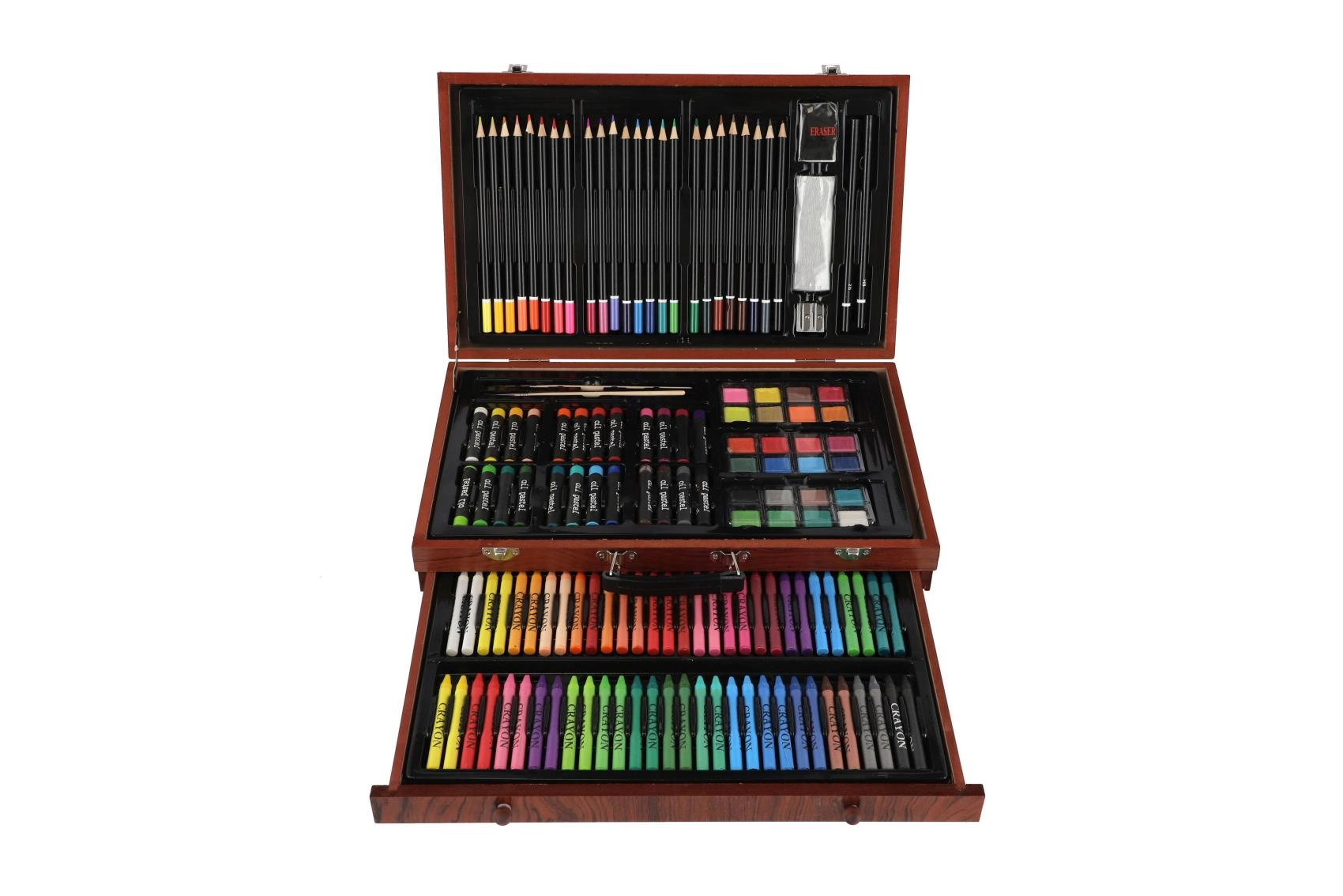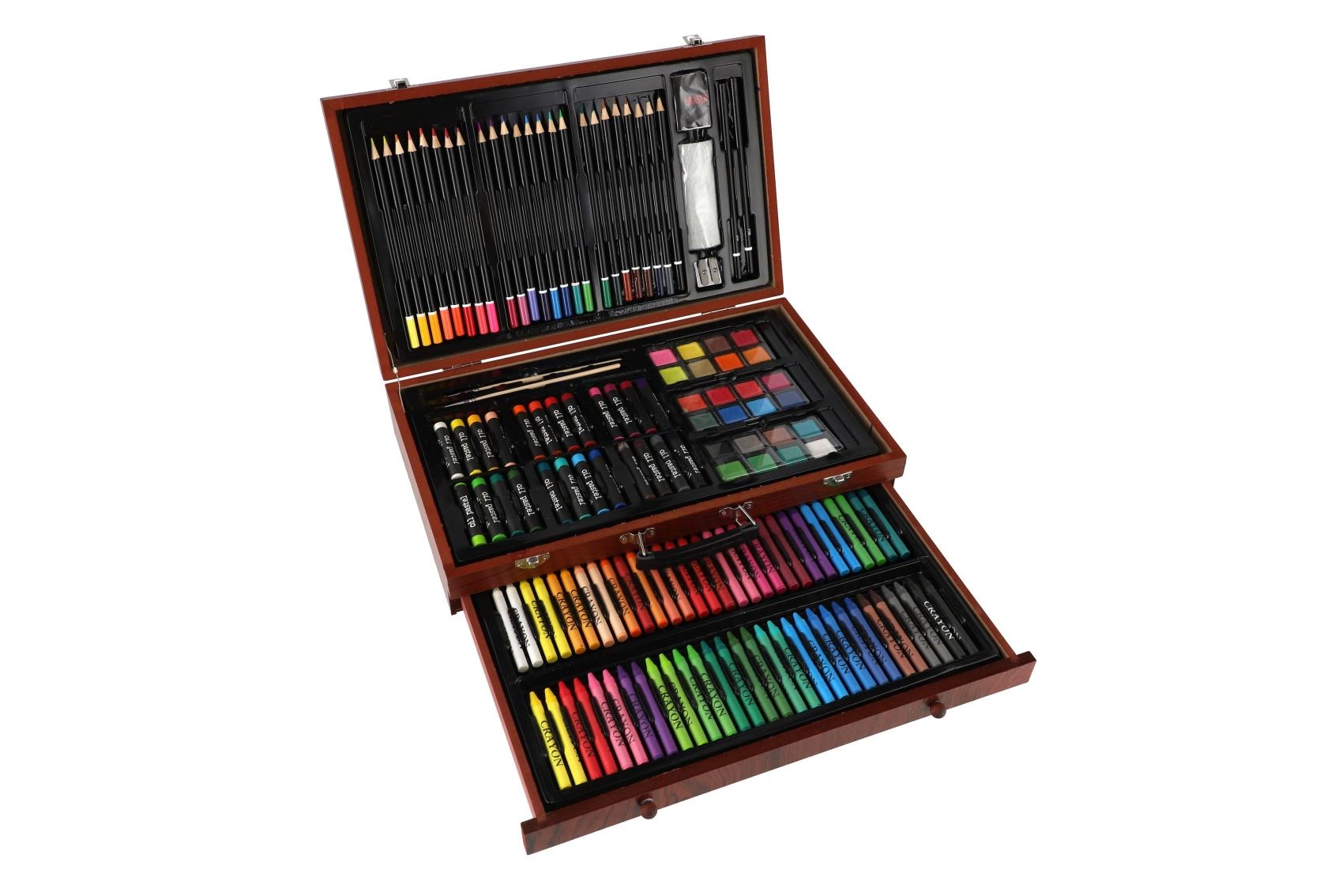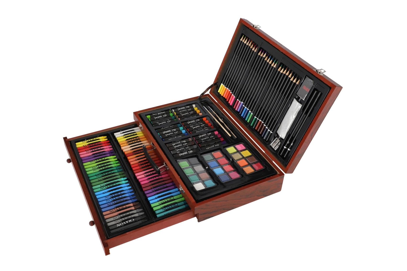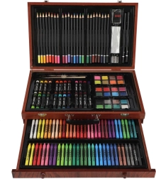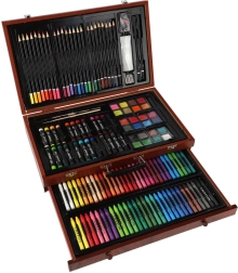 Šis bagātīgais mākslas komplekts ir lieliska izvēle gan iesācējiem, gan pieredzējušiem radītājiem, kuri meklē visu nepieciešamo vienuviet. Kompaktais koka koferītis nodrošina pārskatāmu glabāšanu un ērtu pārnēsāšanu, lai jūs varētu radīt mājās, skolā un ceļā.