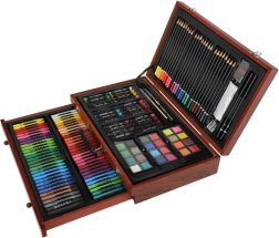 Universāls radošais komplekts mazajiem un lielākajiem māksliniekiem satur kopā 143 detaļas gleznošanai, zīmēšanai un radīšanai. Viss ir pārskatāmi sakārtots elegantā koka koferītī ar aizdari, izmēri 38 × 25 × 8 cm. Ideāli piemērots radošiem darbiem mājās, skolas projektiem un ceļošanai. Piemērots bērniem no 14 gadu vecuma.