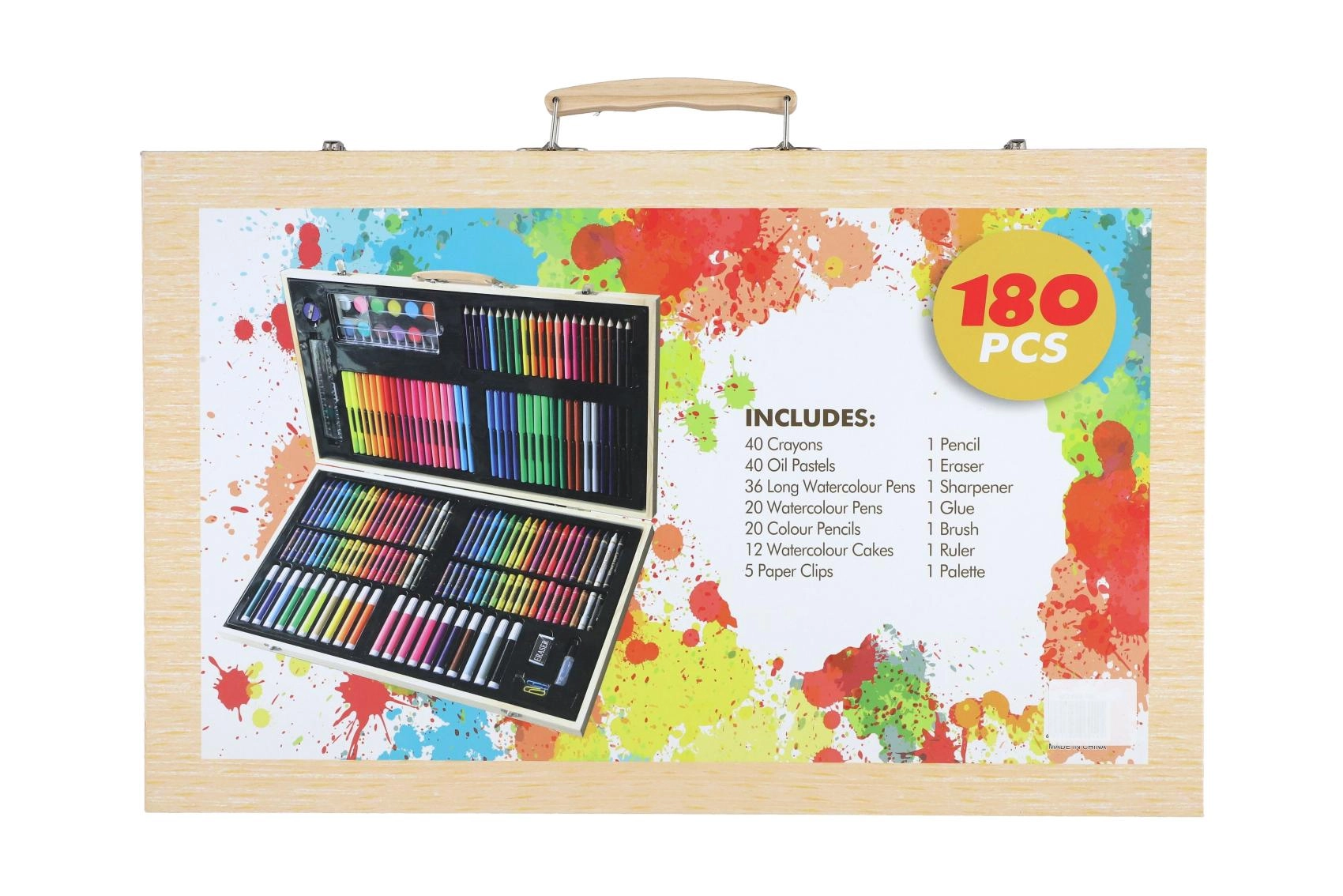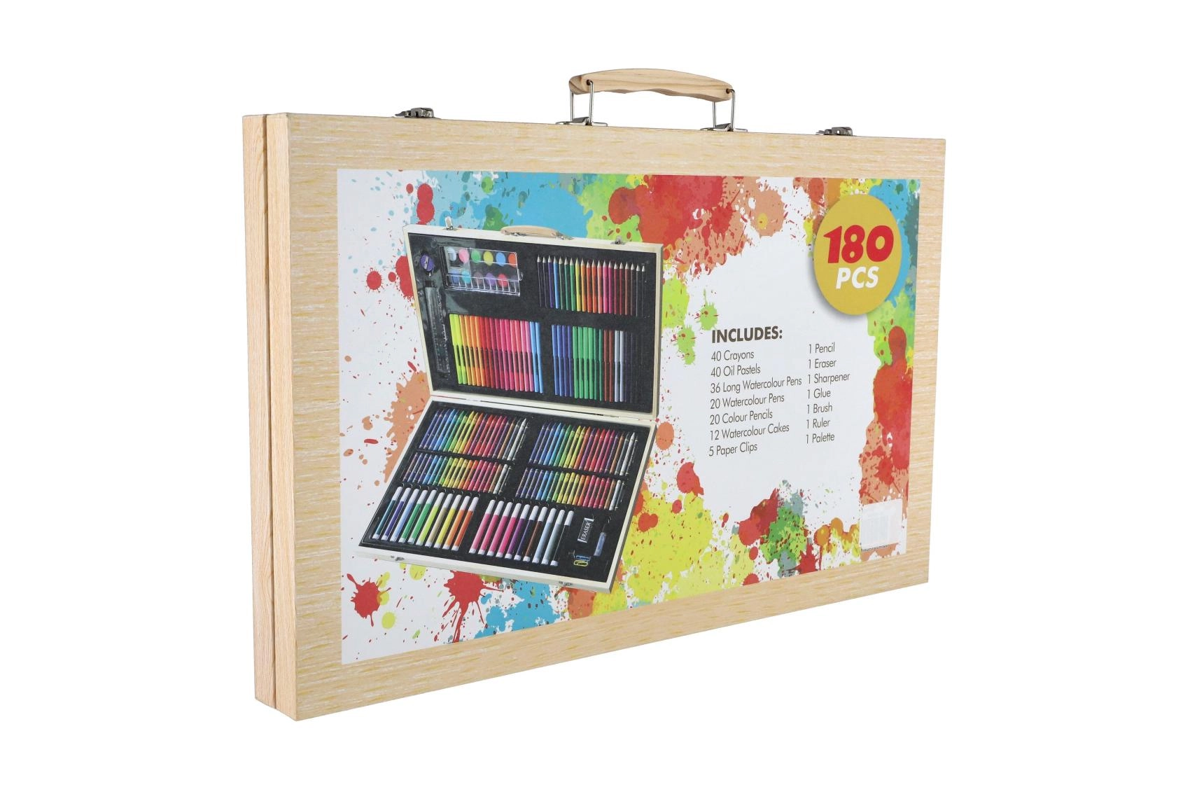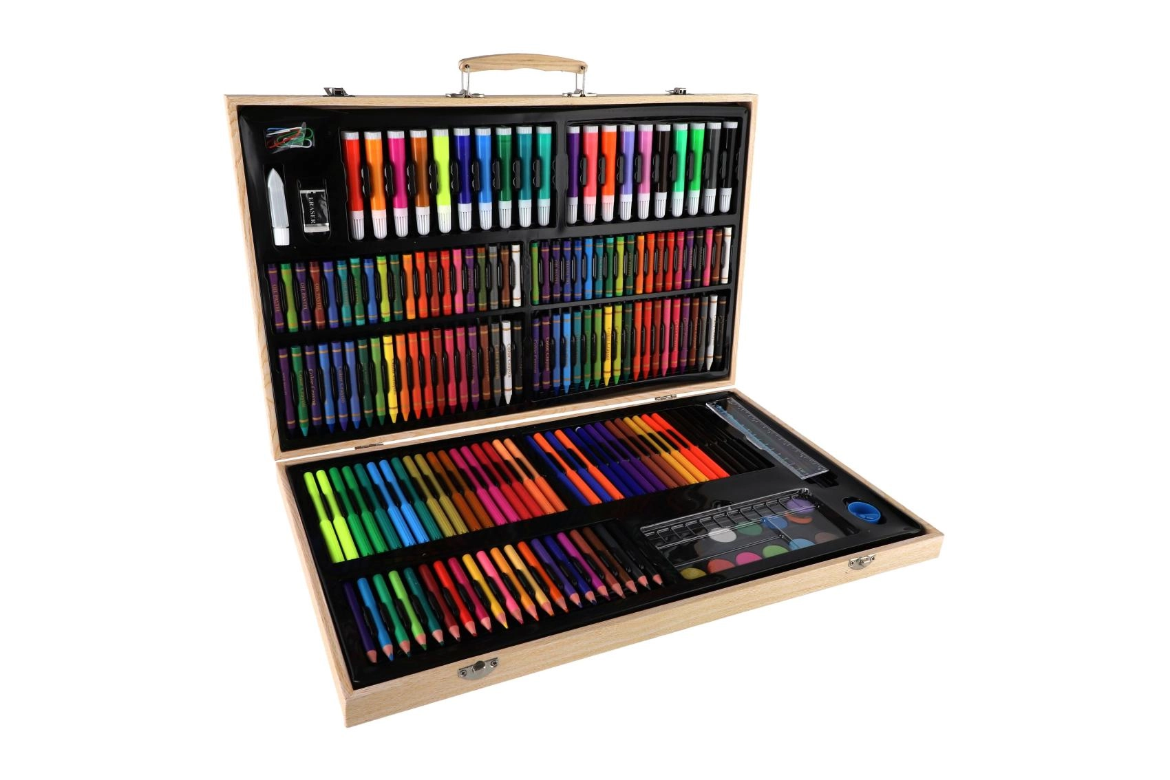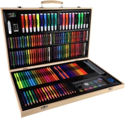 Šis bagātīgais gleznošanas un zīmēšanas komplekts ir ideāli piemērots gan iesācējiem, gan pieredzējušiem entuziastiem. Viss, kas nepieciešams radošai darbībai, ir vienuviet praktiskā koka koferī, kas uztur piederumus pārskatāmi sakārtotus un vienmēr pa rokai.