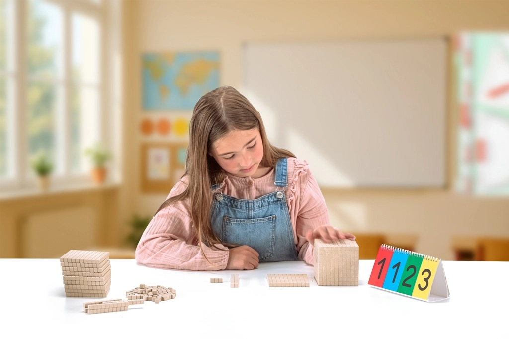 Dienesa pamatkomplekts matemātikas apguvei palīdz bērniem labāk izprast decimālsistēmas principus, manipulējot ar dažādu vērtību klucīšiem. Izgatavots no ekoloģiska materiāla RE-Wood® un ir ideāli piemērots gan individuālai, gan grupu mācībām.