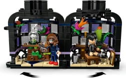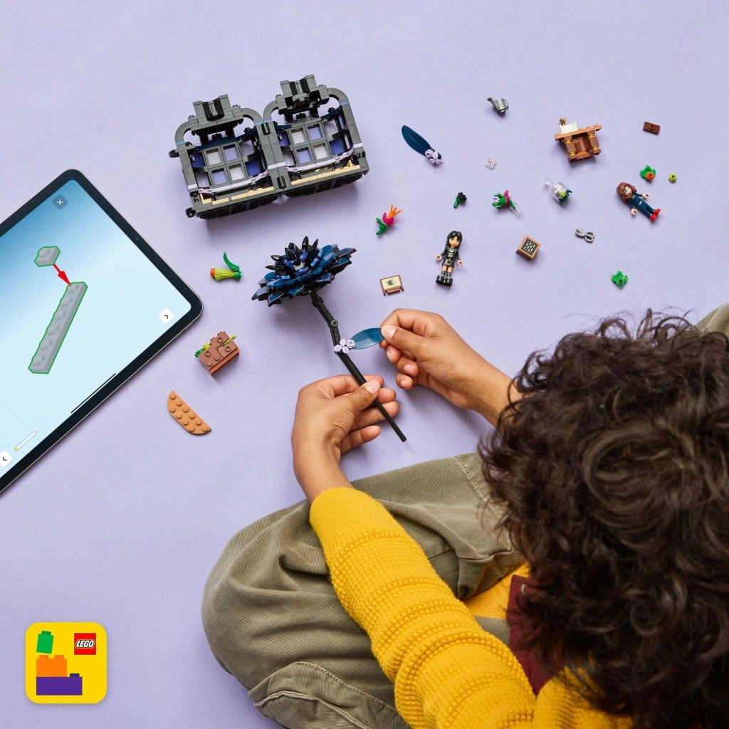Divas minilelles – Wednesday Addams un profesore Marilyn Thornhill – veicina iztēli un piešķir aizraujošu atmosfēru. Pateicoties pārdomātām detaļām, pārvietojamiem elementiem un izvietošanas iespējām, komplekts ir lielisks gan izstādīšanai, gan spēlēšanai. Ar LEGO Builder lietotni vecāki bērni var viegli salikt modeli, pagriezt to 3D skatā un sekot progresam.