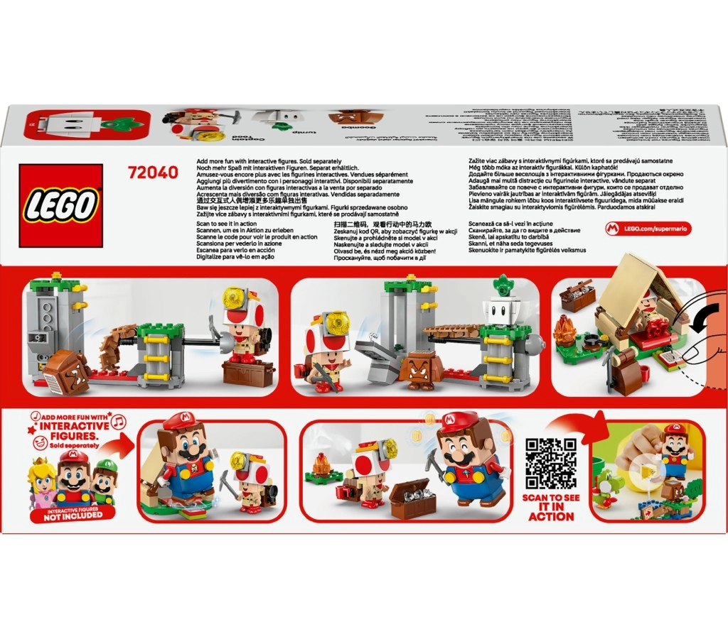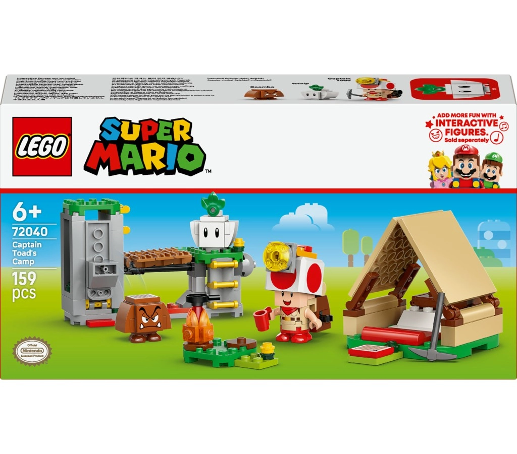 Atklājiet kapteiņa Toada nometni LEGO Super Mario paplašināšanas komplektā ar teltīti, ugunskuru un krītošo tiltu. Iekļautas 3 figūriņas (Kapteinis Toads, Goomba un rācenis), paslēpti “dimanti” un dārgumu lāde. Pievienojiet interaktīvu LEGO Mario, LEGO Luigi vai LEGO Peach figūriņu (pārdodas atsevišķi) un izbaudiet digitālās reakcijas un jautrus izaicinājumus. Ideāla dāvana bērniem no 6 gadu vecuma.