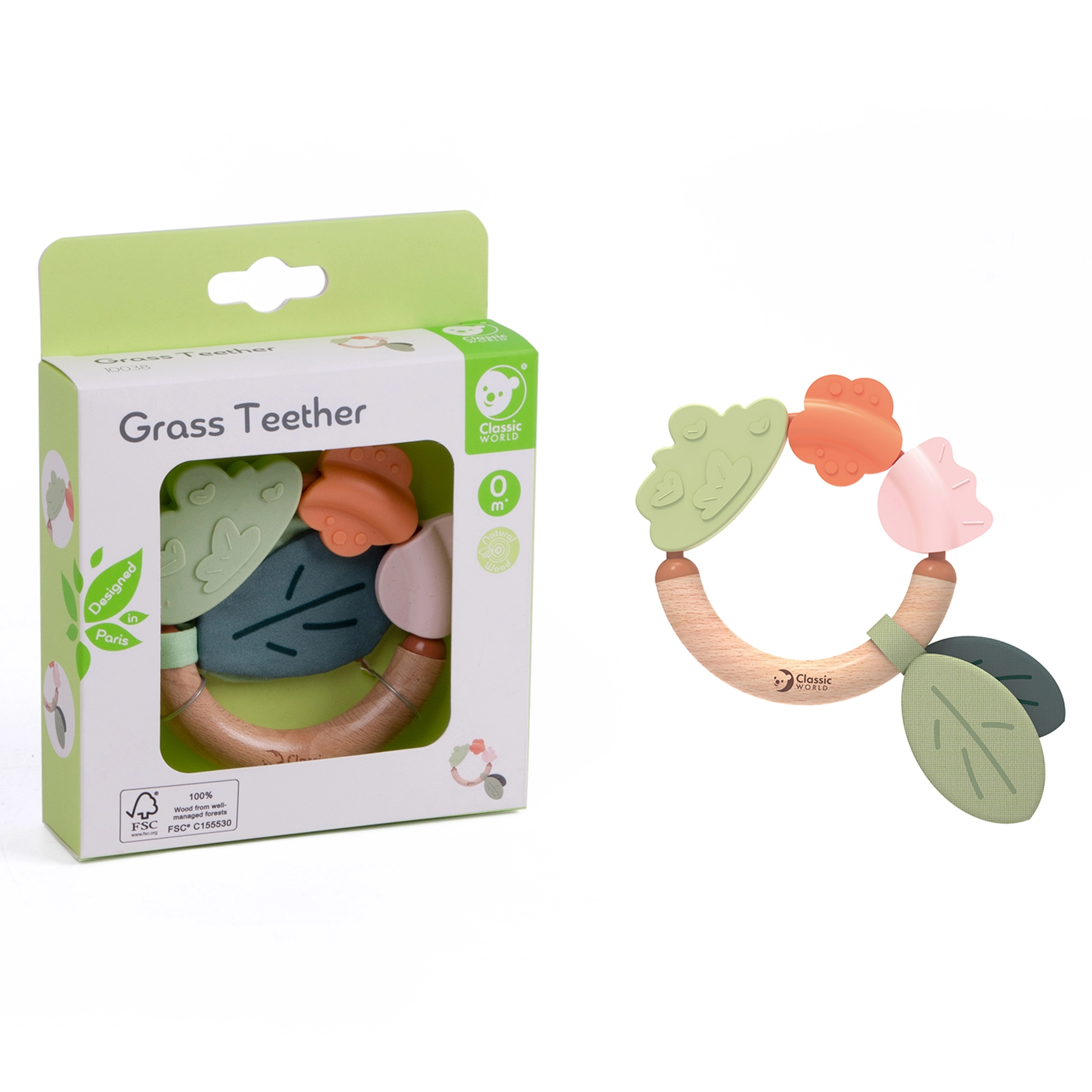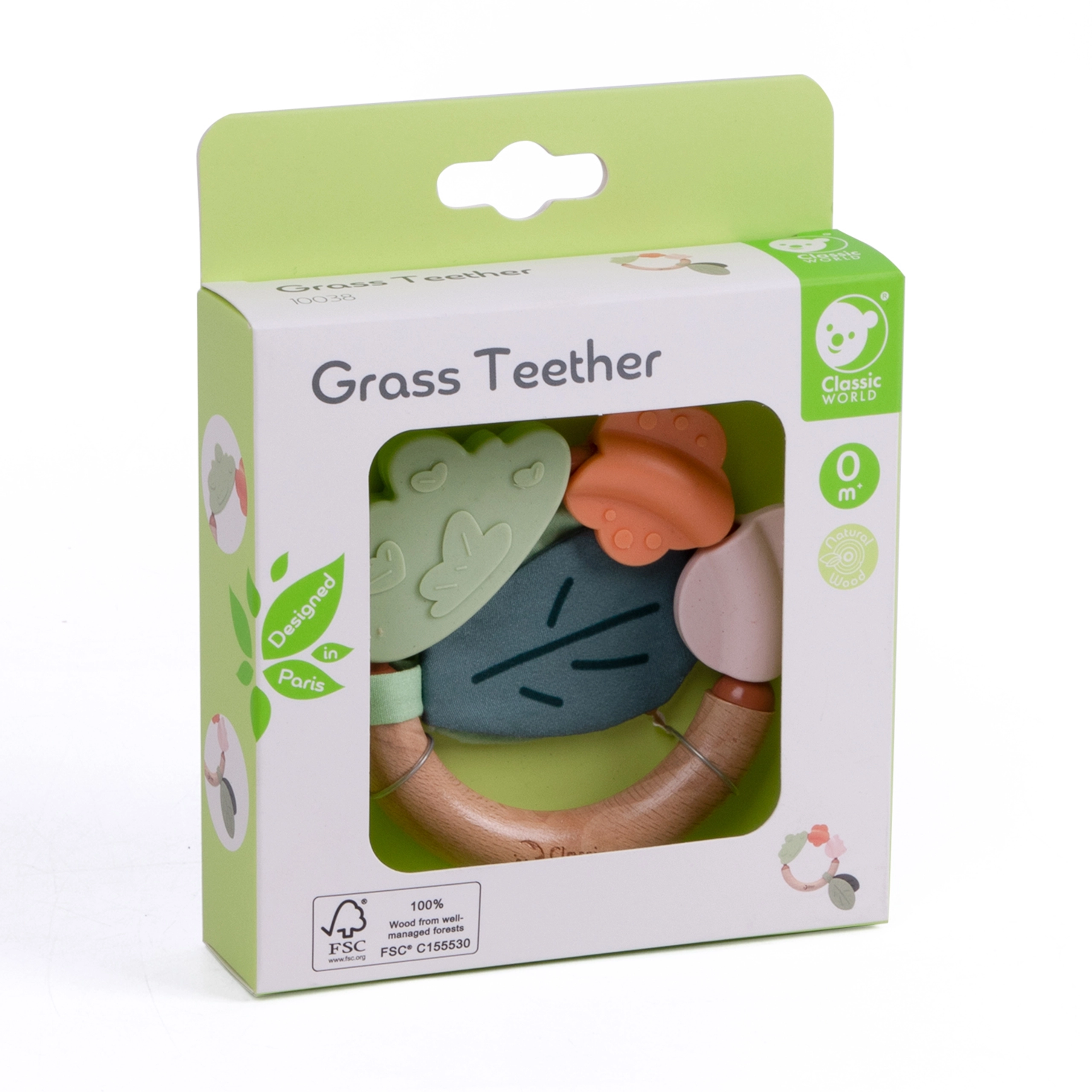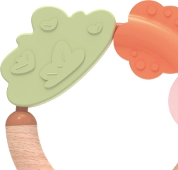 Unikālais dabīgā koka un mīkstā silikona apvienojums stimulē maņas un iedrošina iepazīt pasauli, padarot to par ideālu pirmo košļājamo riņķi un grabulīti jebkuram bērnam.
