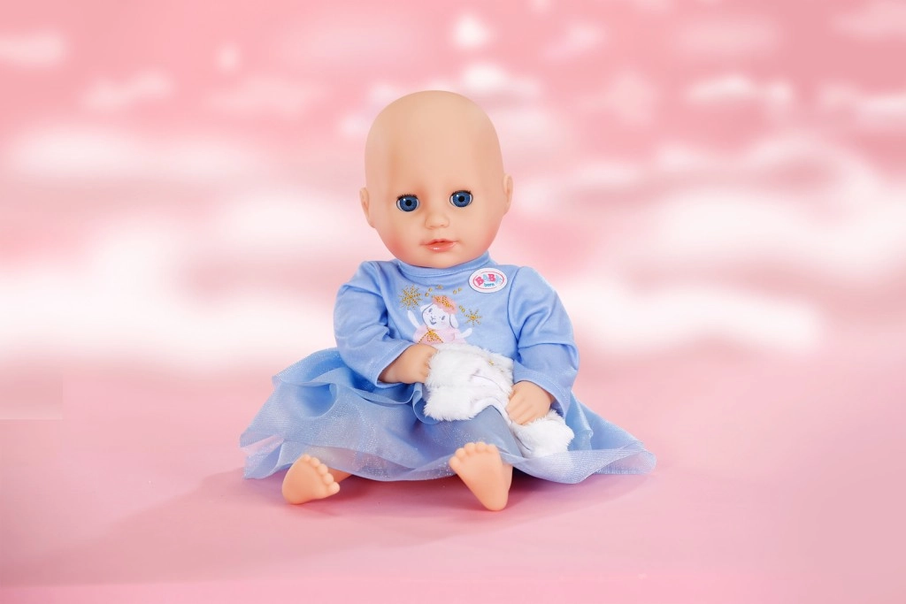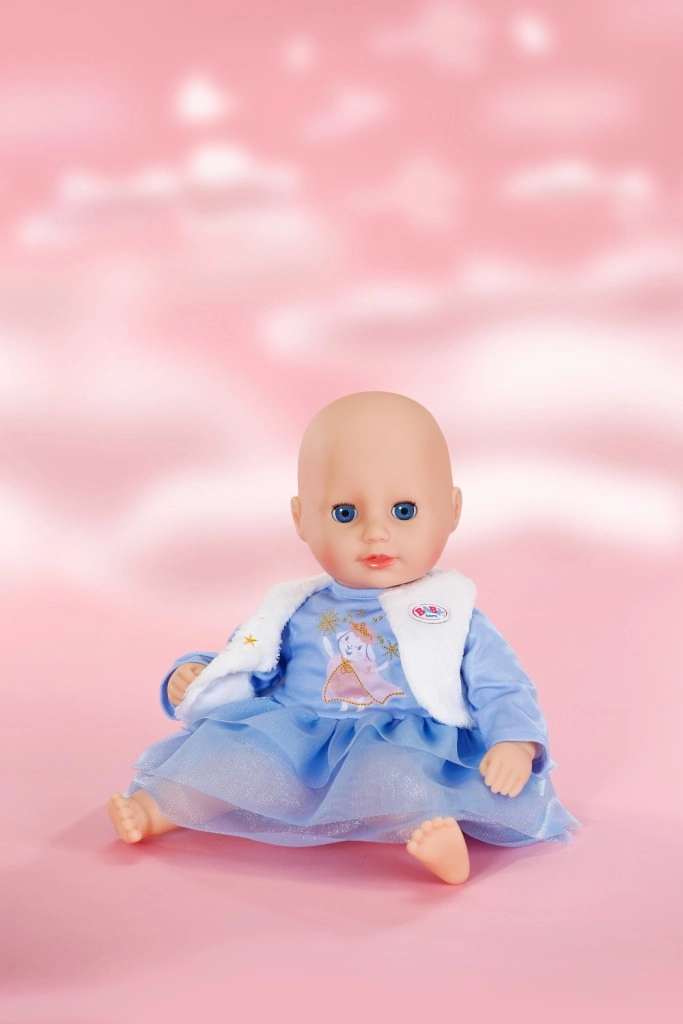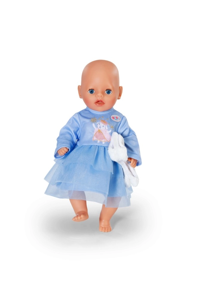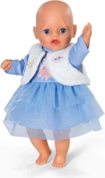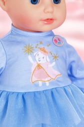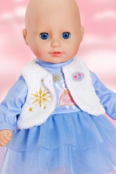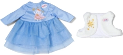 Stilīgs ziemas apģērbs lellēm 36 cm izmērā ietver zilas kleitas ar garām piedurknēm, daudzslāņainu tilla svārciņu un samtaini maigu vestīti. Pateicoties vienkāršam piegriezumam, ģērbšana ir viegla pat pašiem mazākajiem. Komplekts rotaļīgās pasteļkrāsās piedāvā burvīgu ziemas izskatu, ērtu ģērbšanu un daudz radošas izklaides.