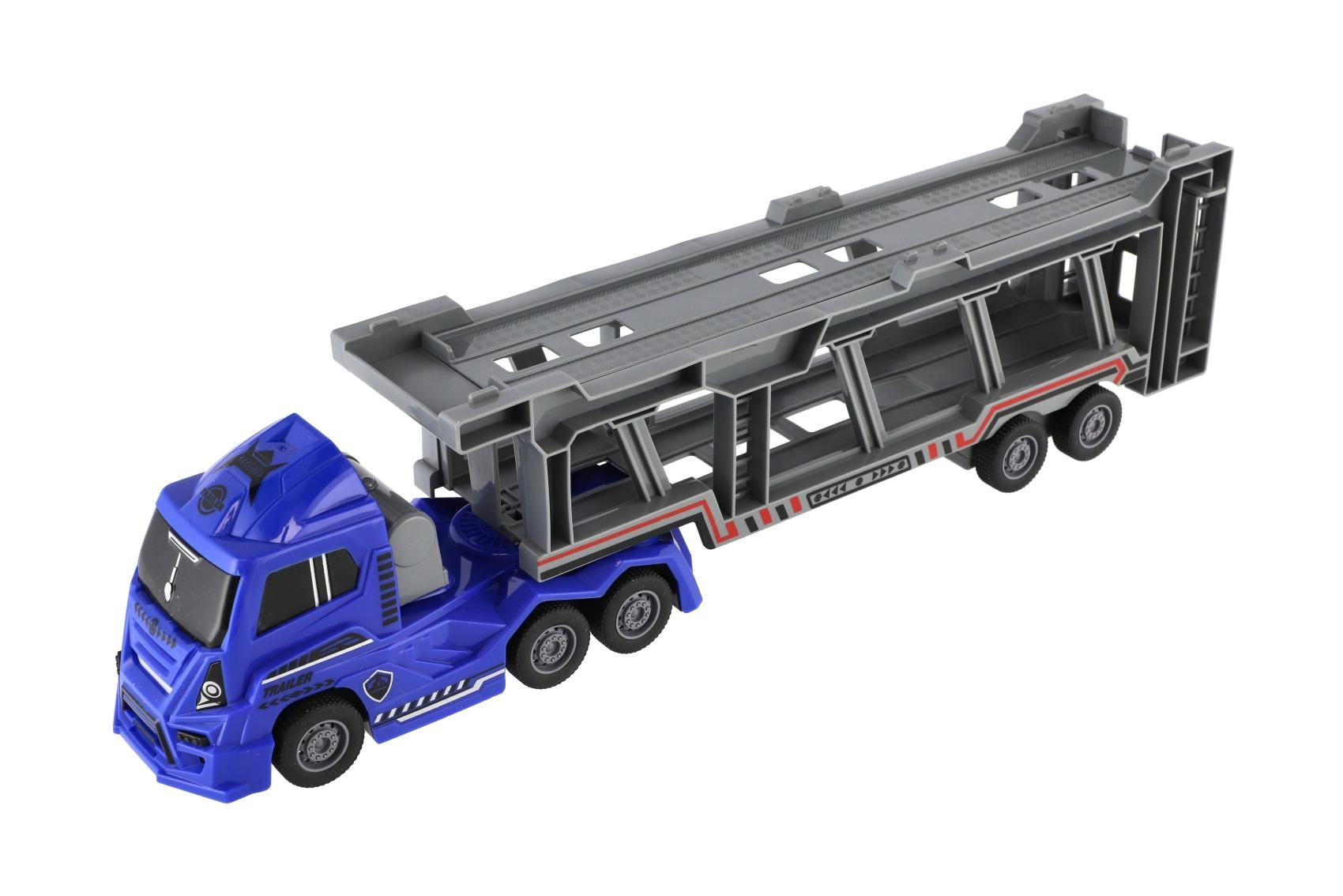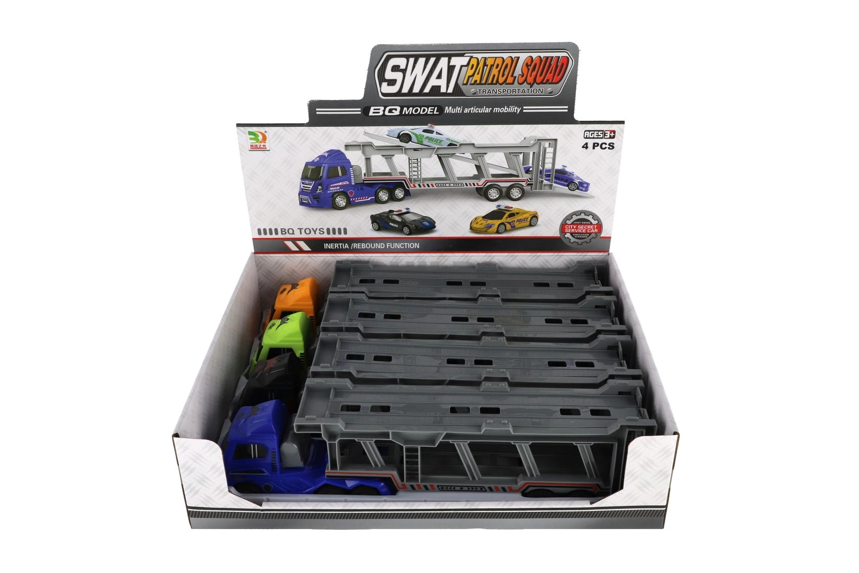 Atbrīvojiet izklaidi ar šo 45 cm plastmasas kravas vedēju! Ar reālistisku dizainu un inerces piedziņu tas ir ideāli piemērots trīs policijas mašīnu pārvadāšanai. Pateicoties funkcionālai rampei, viegli izņemt un iekraut autiņus.