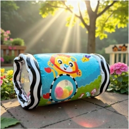 Pateicoties kontrastainiem rakstiem, skatlogu lodziņiem un mīlīgiem dzīvnieciņu attēliem, rotaļlieta ir vizuāli stimulējoša un vienlaikus droša mazām rociņām. Tā ir viegli piepūšama, ērti pārnēsājama un lieliski piemērota spēlēm mājās, ciemos un ceļā.