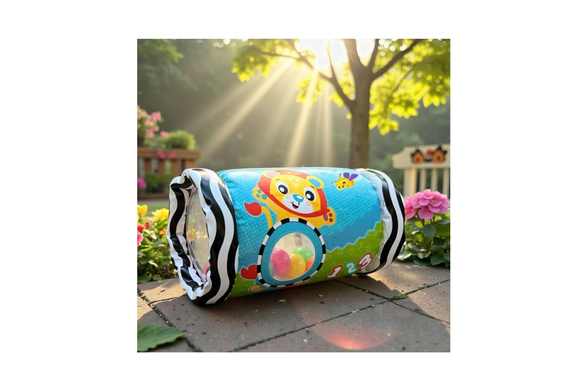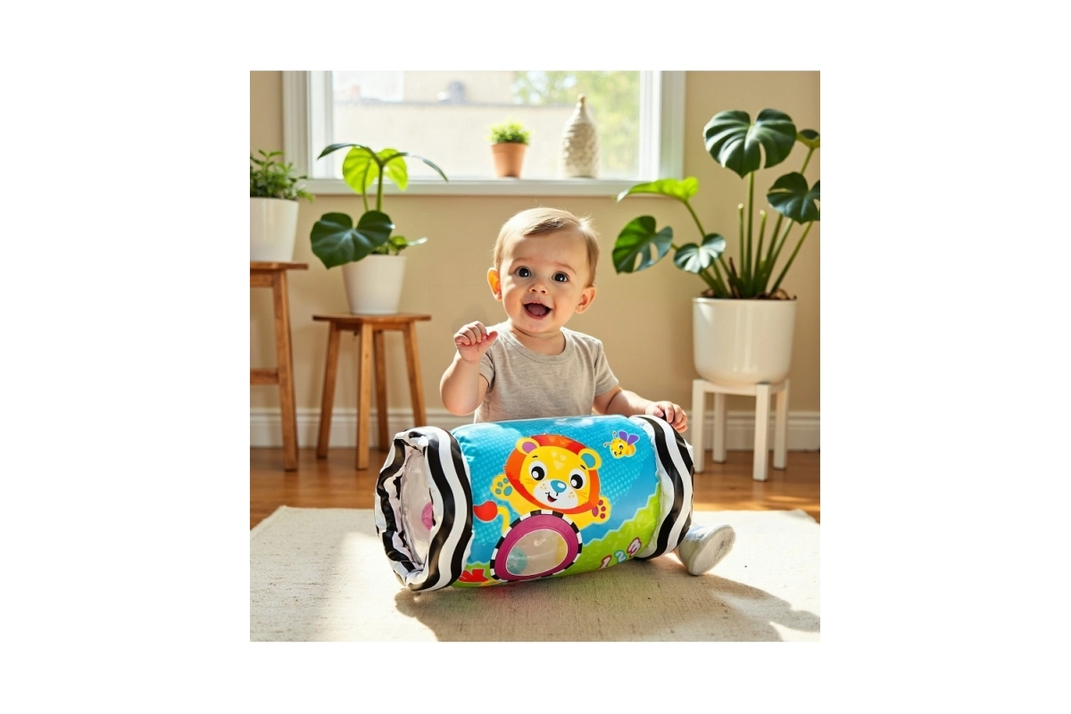 - Rāpošanas un koordinācijas veicināšana: Veltnis vienmērīgi ripo un mudina bērnu virzīties uz priekšu.