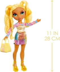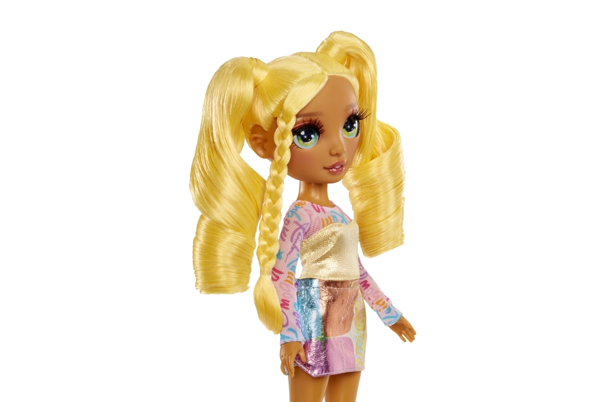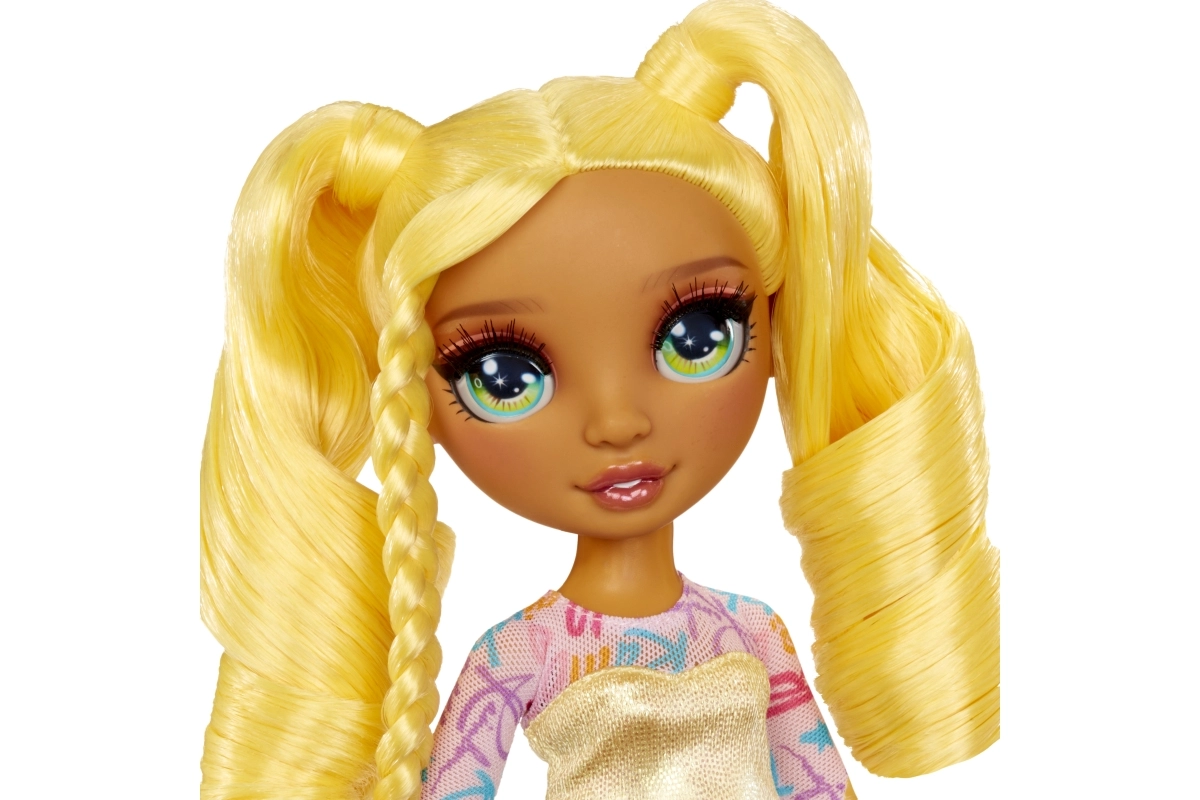 Sunny no RAINBOW HIGH ir pārliecināta modes mūza, kas iedvesmo bērnus paust savu individualitāti. Viņas tērpā apvienoti spilgti dzelteni un varavīksnes akcenti – izteiksmīgs tops, mūžīga svārku līnija, elegantas kurpītes un pieskaņota somiņa. Mati, ieveidoti rotaļīgos bizīšu copēs, aicina uz radošumu ķemmēšanā.