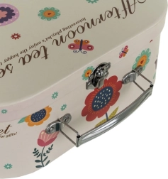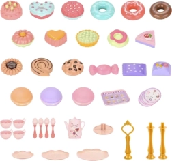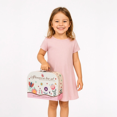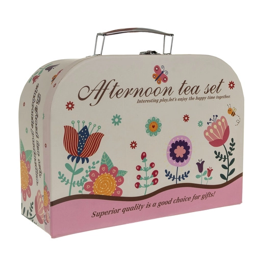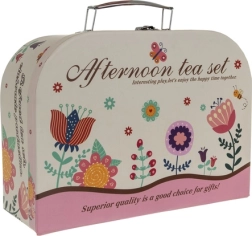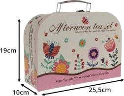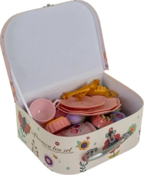 Iepakojuma saturs: koferītis ar rokturi un metāla aizdari, trīsstāvu saldumu statīvs, tējkanna ar vāciņu, 4 rozā tasītes, 4 šķīvīši ar ziedu motīviem, 4 dekoratīvas karotītes, servēšanas paplāte, 20 saldumi (konfektes, virtuļi, makarūni, cepumi), brūna transportēšanas kārba.