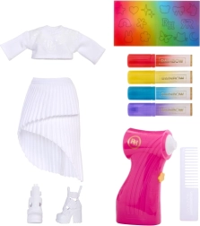 Komplektā ir stilīga lelle ar gariem baltiem matiem, locītavu ķermeni un pilnībā baltu tērpu, kas gatavs krāsošanai. Atdzīviniet tās matus, kleitu un kurpes, bet detaļas precīzai apdarei papildiniet ar marķieri, lai iegūtu precīzu dekoru. Ideāla dāvana bērniem, kuri mīl modi, krāsas un radošu darbošanos.