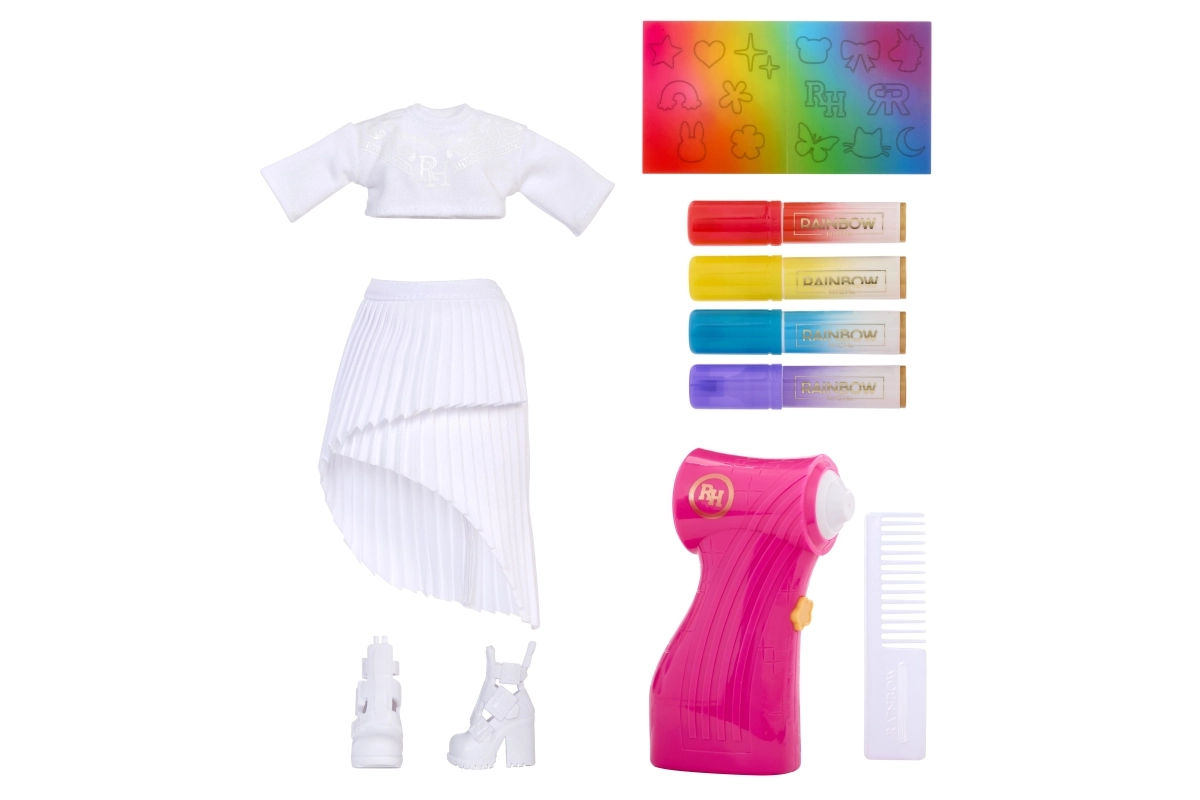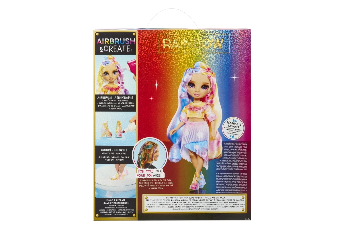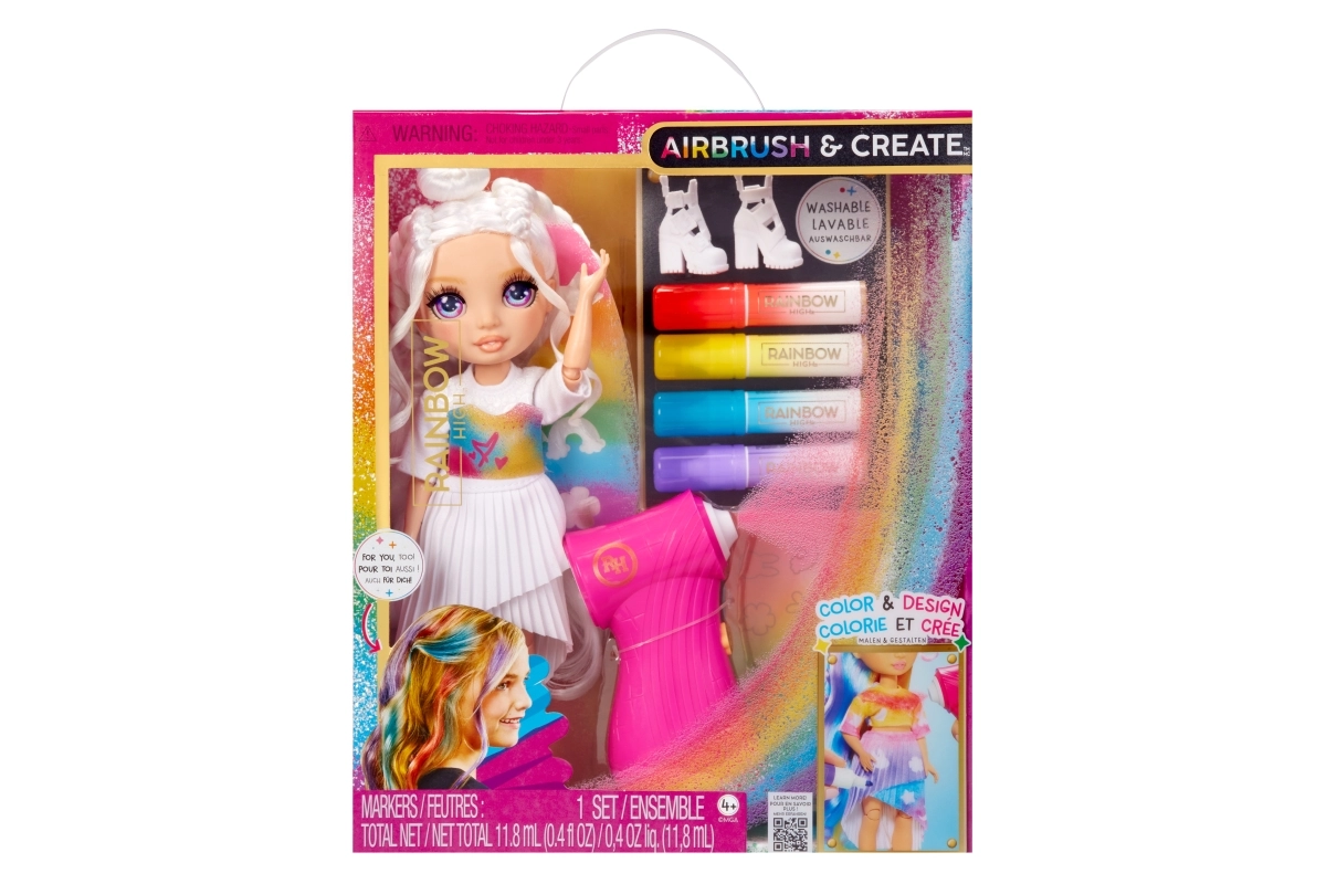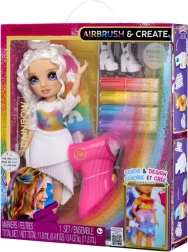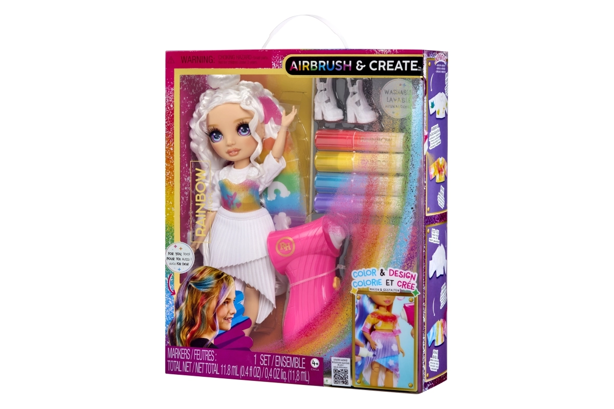 Rainbow High Airbrush & Create lelle ir kā tukšs audekls mazajiem dizaineriem. Ar iekļautajiem mazgājamajiem marķieriem un gaisa aplikatoru jūs viegli izveidosiet oriģinālu izskatu – no maigām pārejām līdz izteiksmīgiem rakstiem. Gatavo dizainu var jebkurā brīdī nomazgāt un sākt no jauna.
