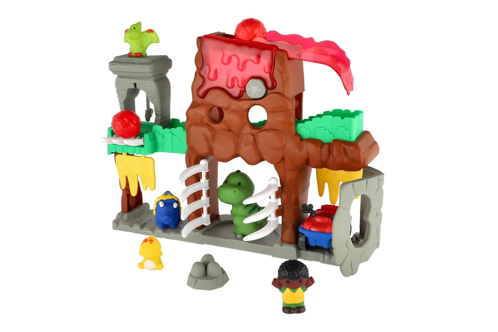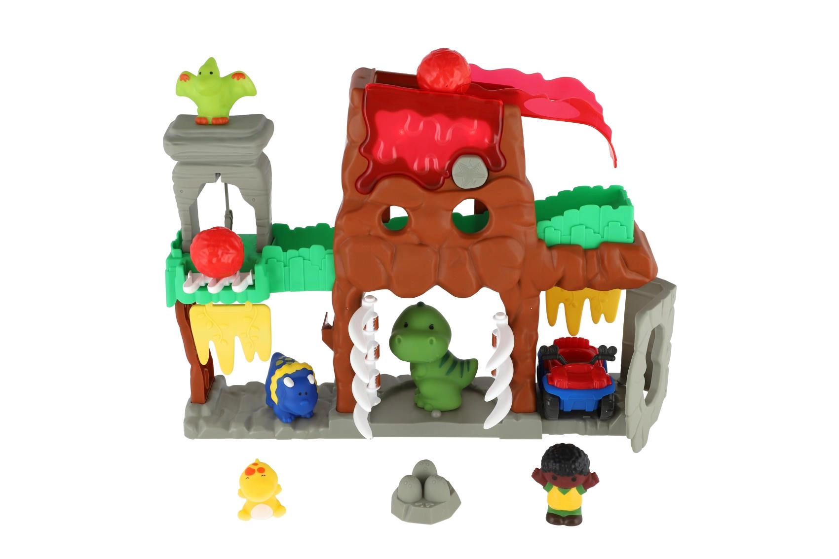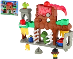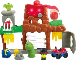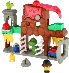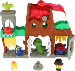 Atklājiet interaktīvu dinozauru pasauli ar vulkānu, tuneļiem un kustīgiem elementiem, kas iedvesmo radošai spēlei. Bērni var palaist akmeņus, braukt ar transportlīdzekli, atvērt vārtus un izdomāt aizraujošus stāstus ar mīlīgām figūrām.
