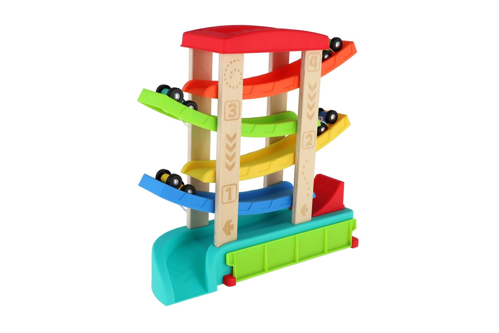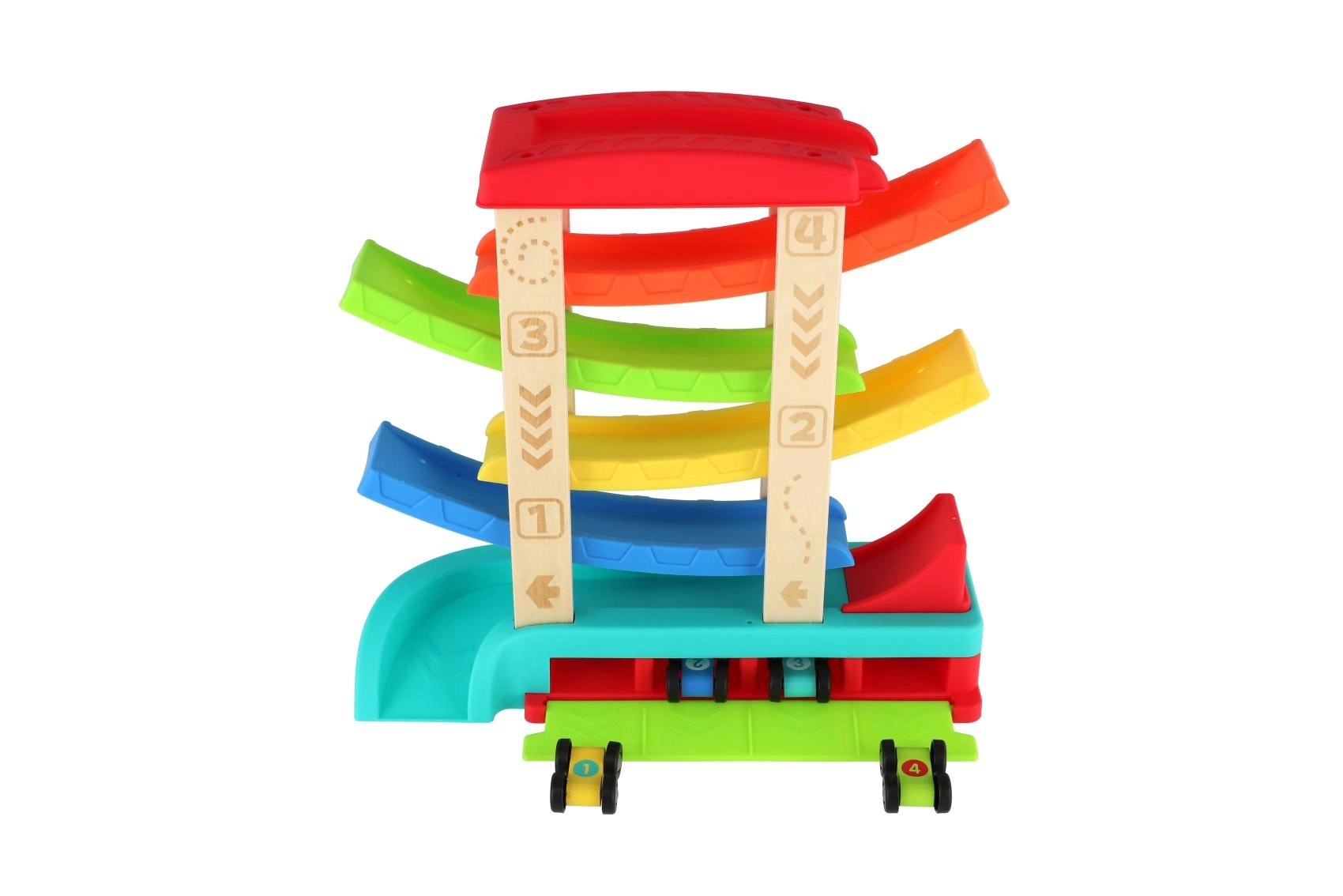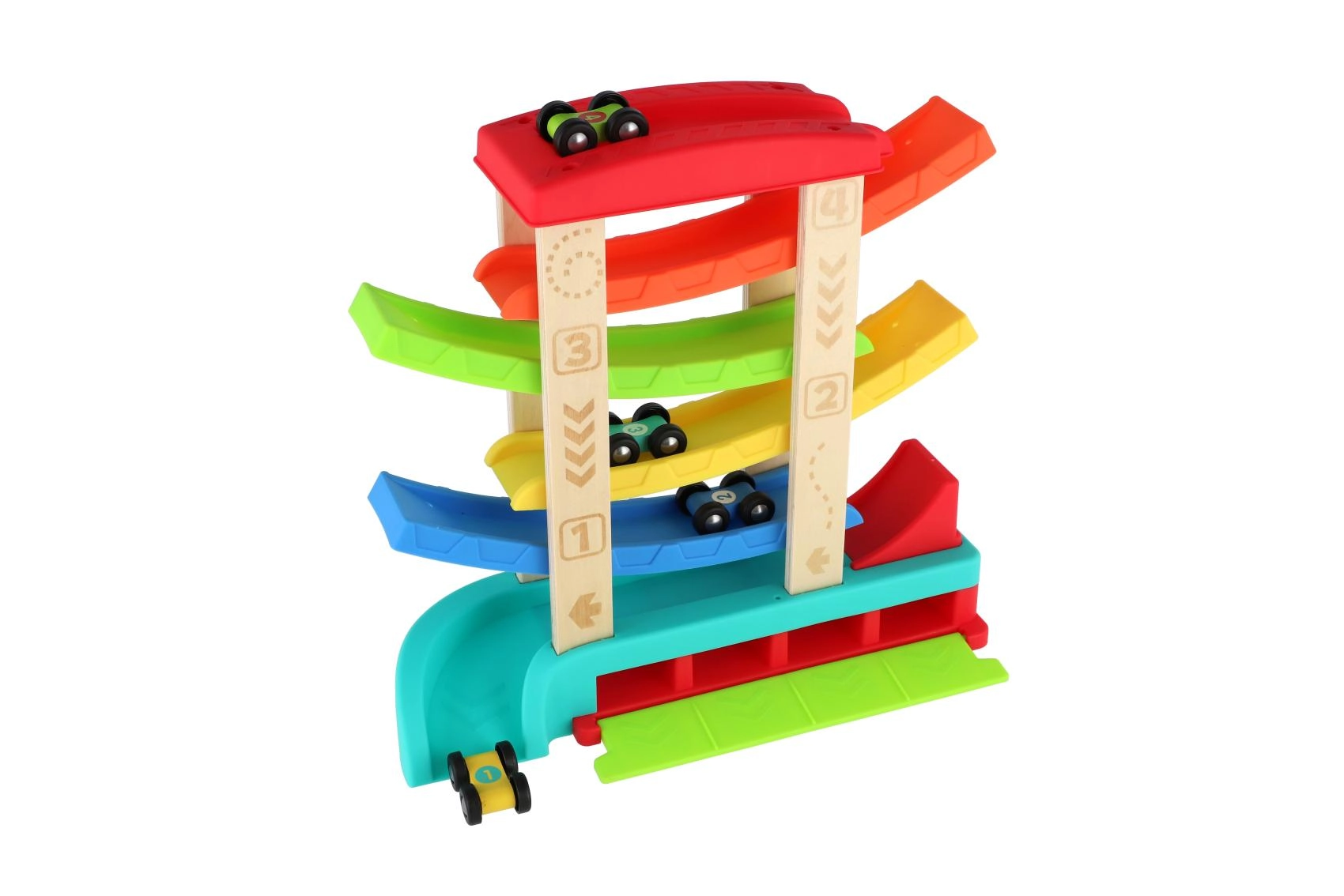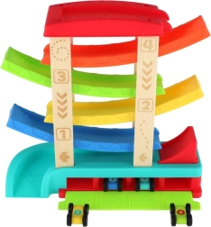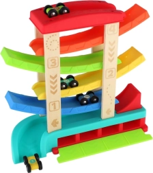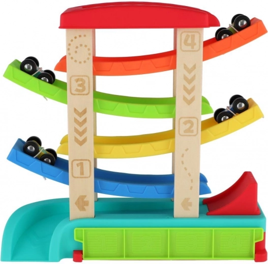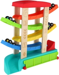 Krāsaina kaskādes sacīkšu trase no kvalitatīva koka un plastmasas nodrošinās bērniem stundām ilgu izklaidi. Vienkārši novietojiet mašīnīti uz augšējās platformas un vērojiet, kā tā traucas pa rampām līdz finišam. Iepakojumā ir 4 sacīkšu mašīnītes, kas ir ideāli piemērotas mazām bērnu rociņām. Trasei ir stabila konstrukcija, gludas malas un tā ir piemērota bērniem no 18 mēnešu vecuma.
